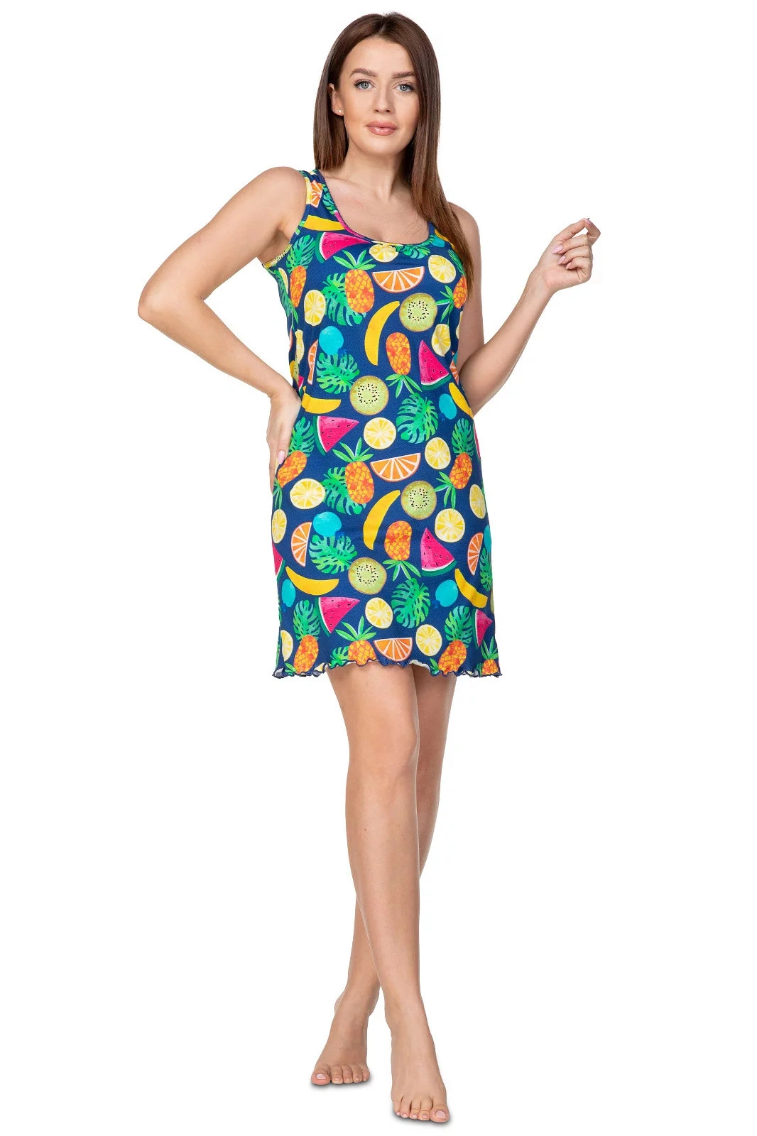 Vzorovaná dámská noční košile na širokých ramínkách. Ušitá z barevné a příjemné bavlny. Má polokulatý výstřih a délku do poloviny stehen.