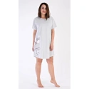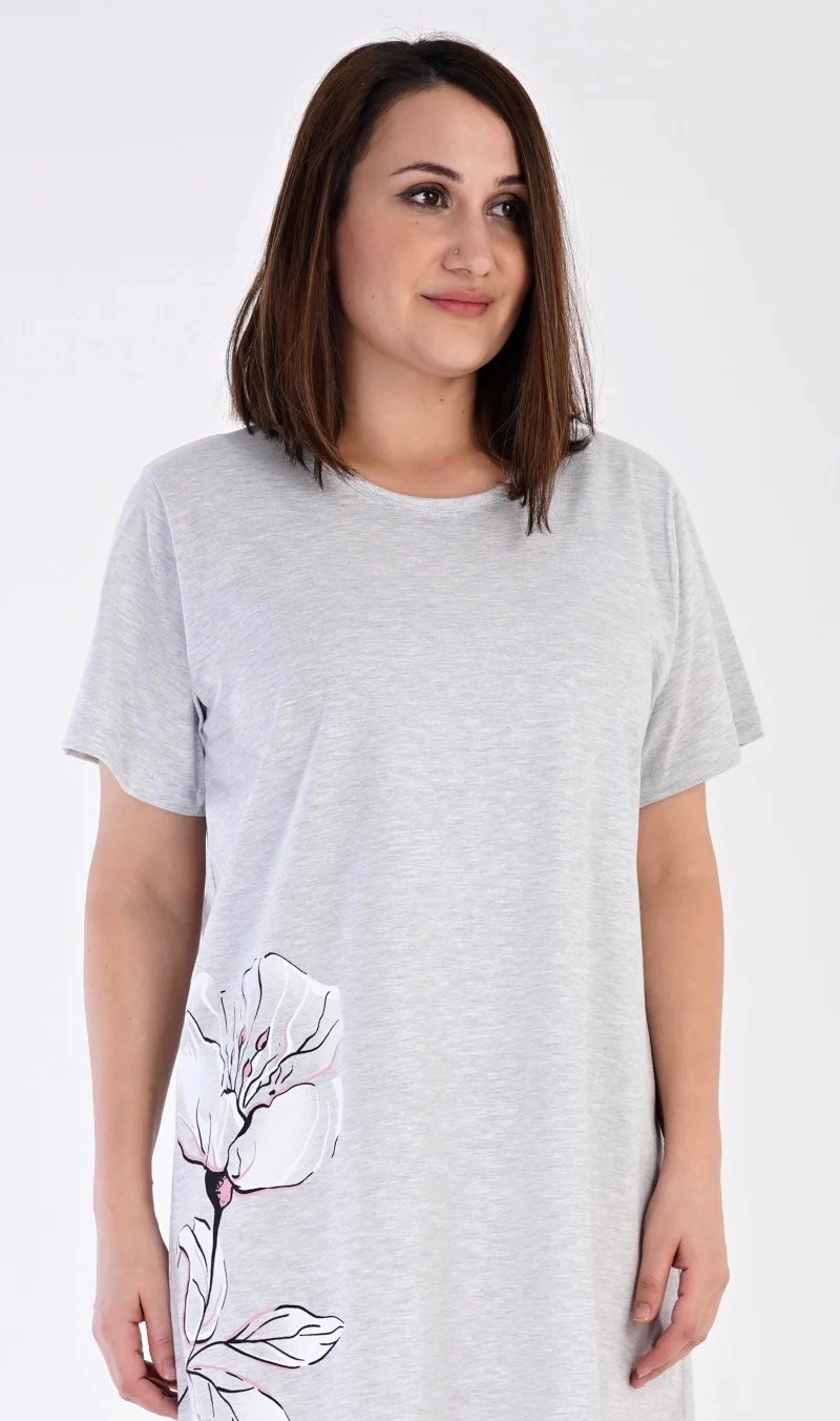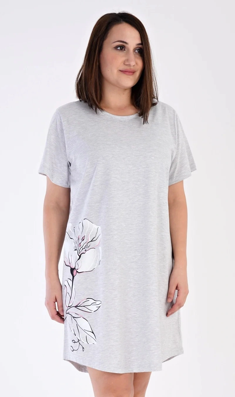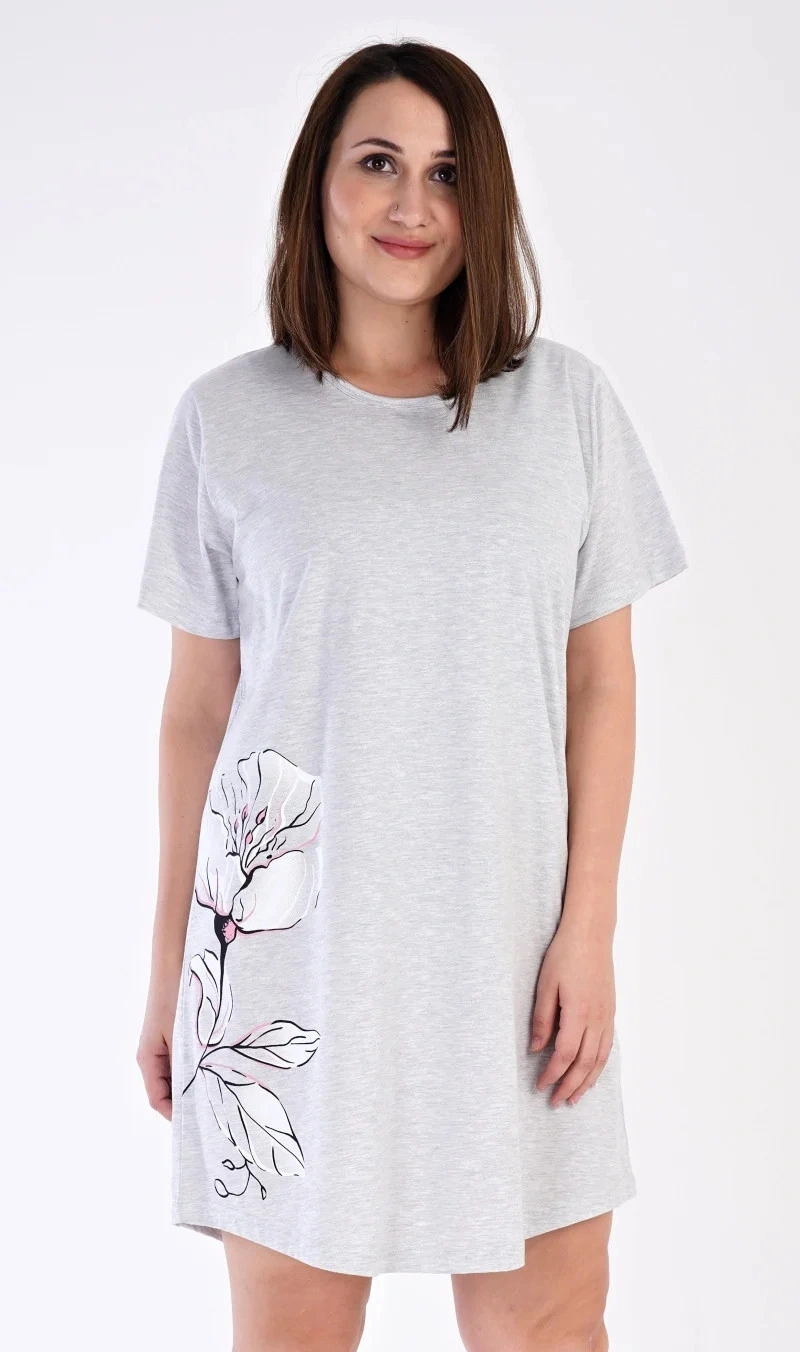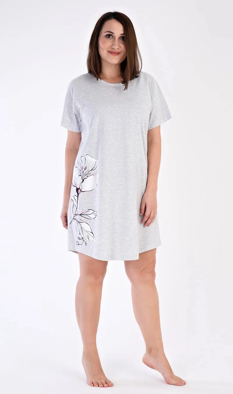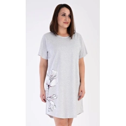 Dámská noční košile s krátkým rukávem Nicol. Noční košile s kulatým výstřihem má ve spodní části na boku obrázek květiny. Použitý materiál je příjemný a poddajný na dotek. Obsah bavlny u lososové barvy je 100% a u světle šedé 70%.