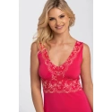 Jemná noční košilka na široká ramínka, bohatě zdobená krajkou. Najdete ji na výstřihu, v pase a na zádech. Přední i zadní strana košile vypadá velmi působivě. Díky nabírání na poprsí a pružnému pásku pod ním je skvělou volbou i pro ženy, které obvykle nosí podprsenky s většími košíčky. Košile je vyrobena ze sametové viskózy, která dokonale padne na tělo. Materiál je pružný a přizpůsobí se postavě. Střih pod prsy zakrývá bříško a bohaté krajkové zdobení zvýrazňuje výstřih a záda.
