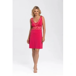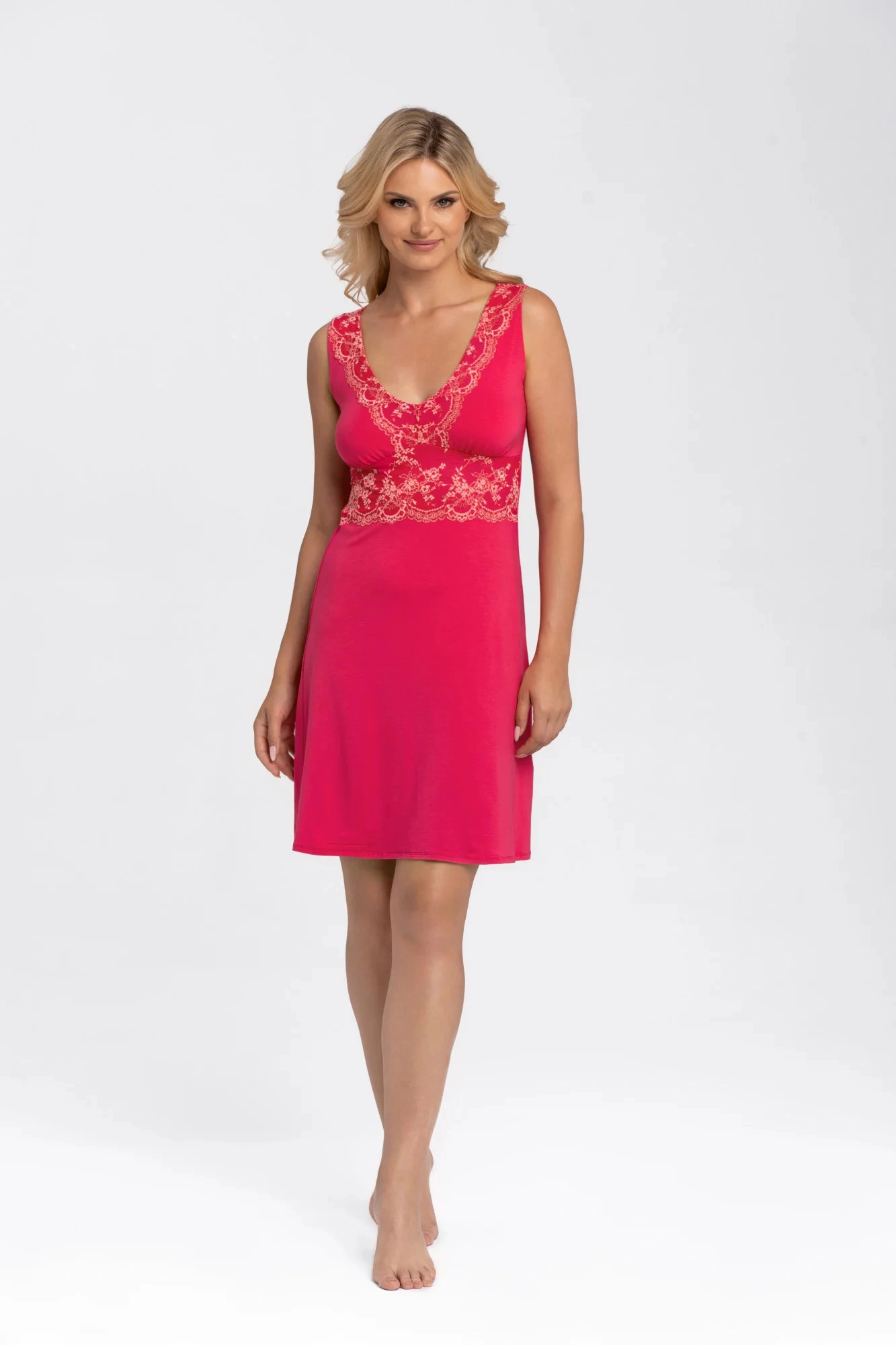 Jemná noční košilka na široká ramínka, bohatě zdobená krajkou. Najdete ji na výstřihu, v pase a na zádech. Přední i zadní strana košile vypadá velmi působivě. Díky nabírání na poprsí a pružnému pásku pod ním je skvělou volbou i pro ženy, které obvykle nosí podprsenky s většími košíčky. Košile je vyrobena ze sametové viskózy, která dokonale padne na tělo. Materiál je pružný a přizpůsobí se postavě. Střih pod prsy zakrývá bříško a bohaté krajkové zdobení zvýrazňuje výstřih a záda.