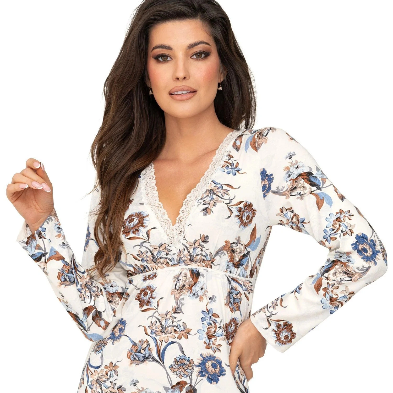 Dámská noční košilka Naomi Donna - krémová barva - z vysoce jakostní viskózy - s dlouhými rukávy - výstřih ve tvaru V zdobený krajkou - s květinovým vzorem - spodní lem zakončený volánkemMateriálové složení: 95% viskóza + 5% elastan