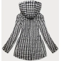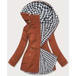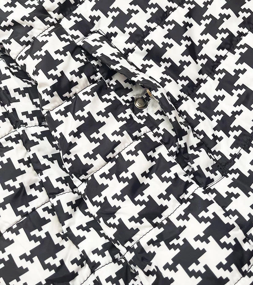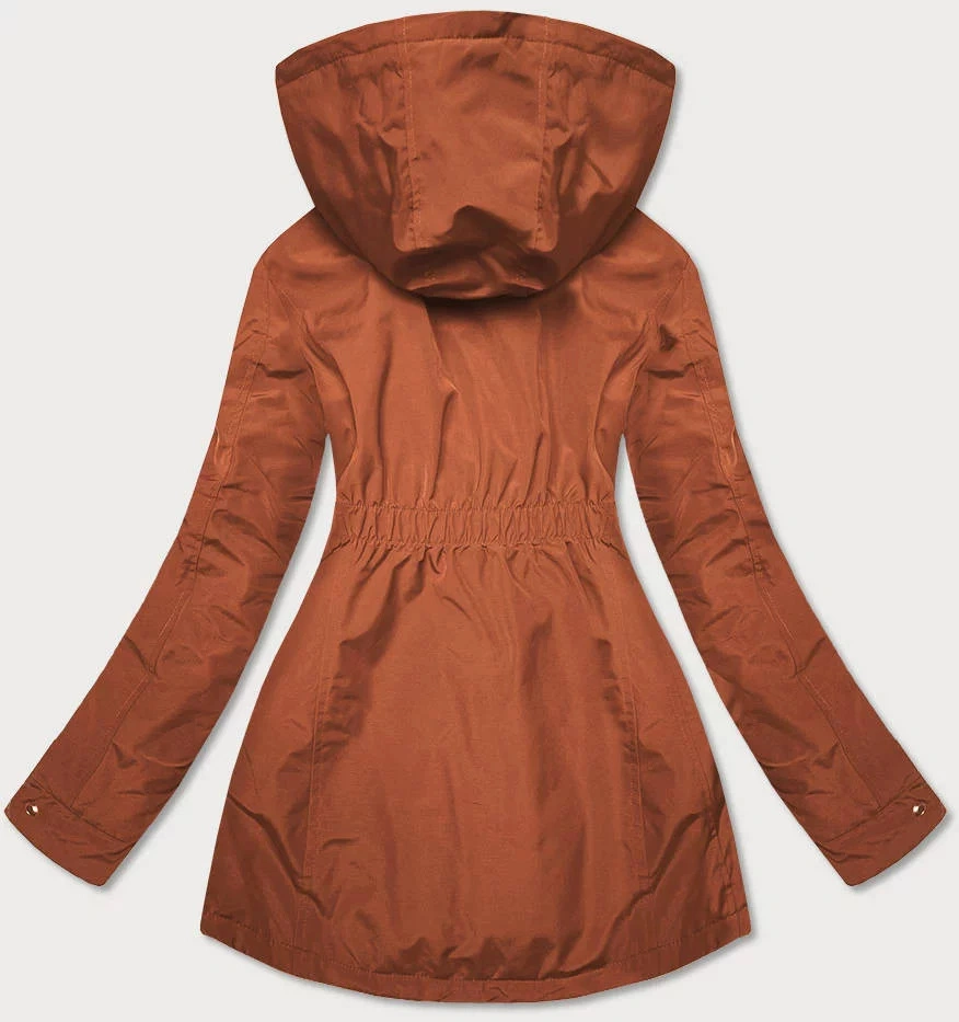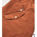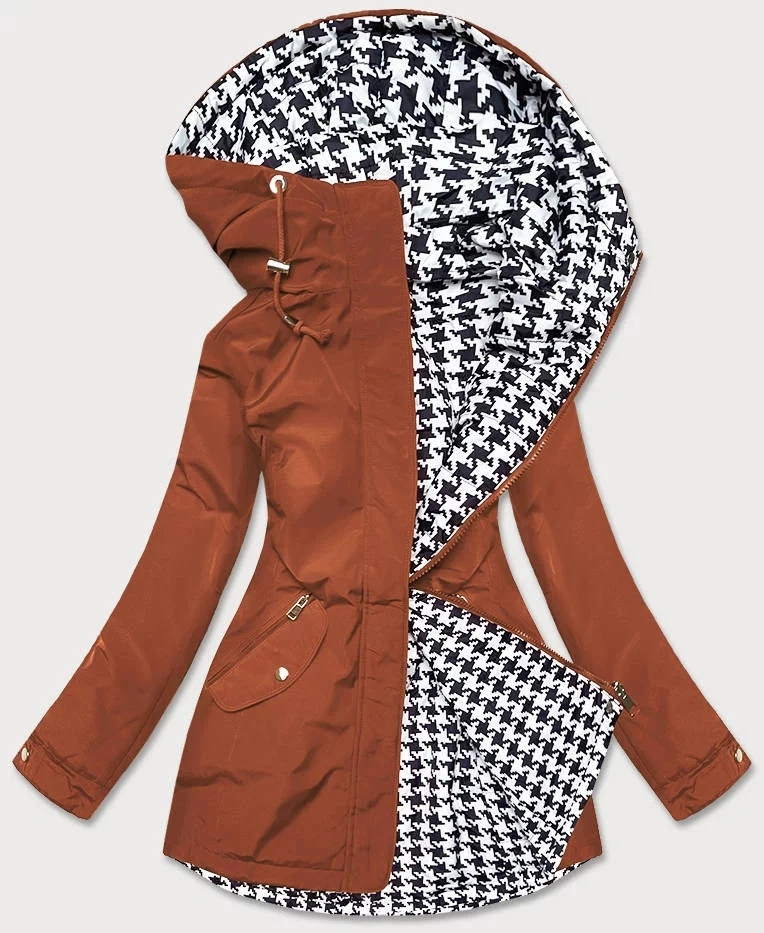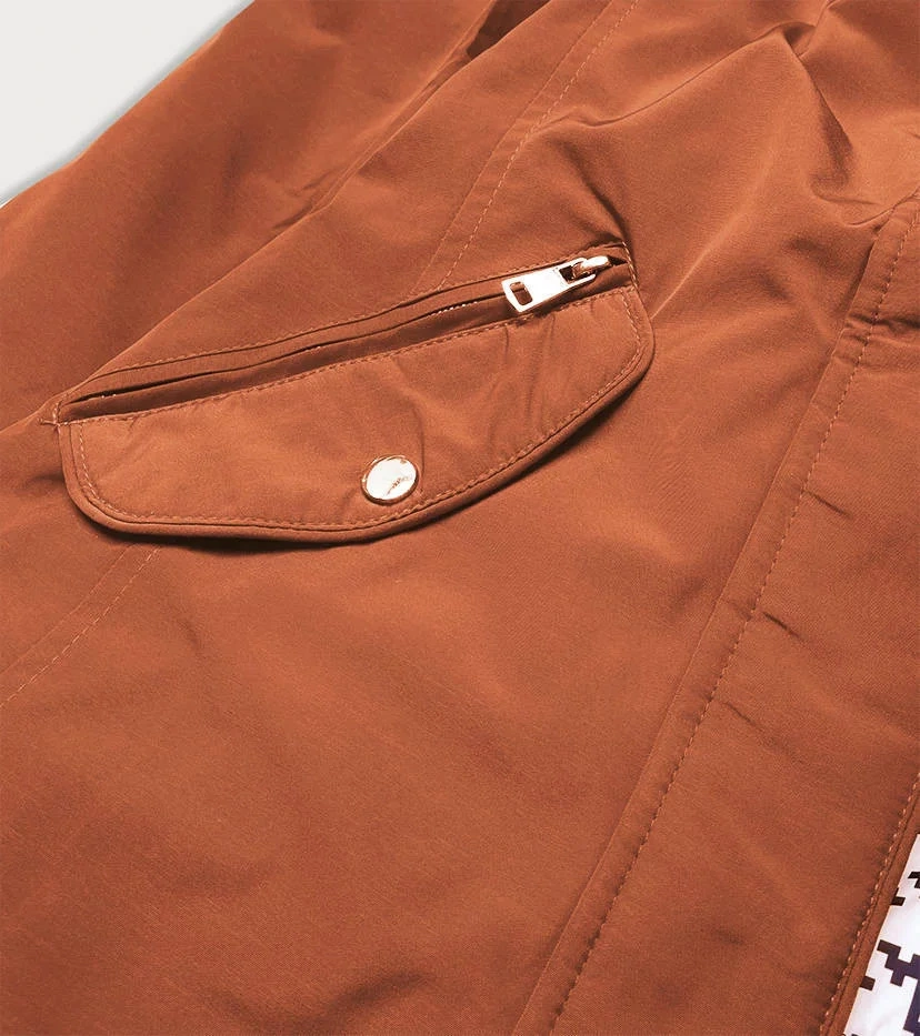 Bunda je lehce zateplená syntetickou péřovou výplní. Jedna strana bundy je hladká a druhá je lehce prošívaná. Model má kapuci, kterou není možné odepnout. V pase modelu je vzadu guma. Na každé straně bundy jsou dvě kapsy. Všechny zipy a patentky mají stříbrnou barvu.