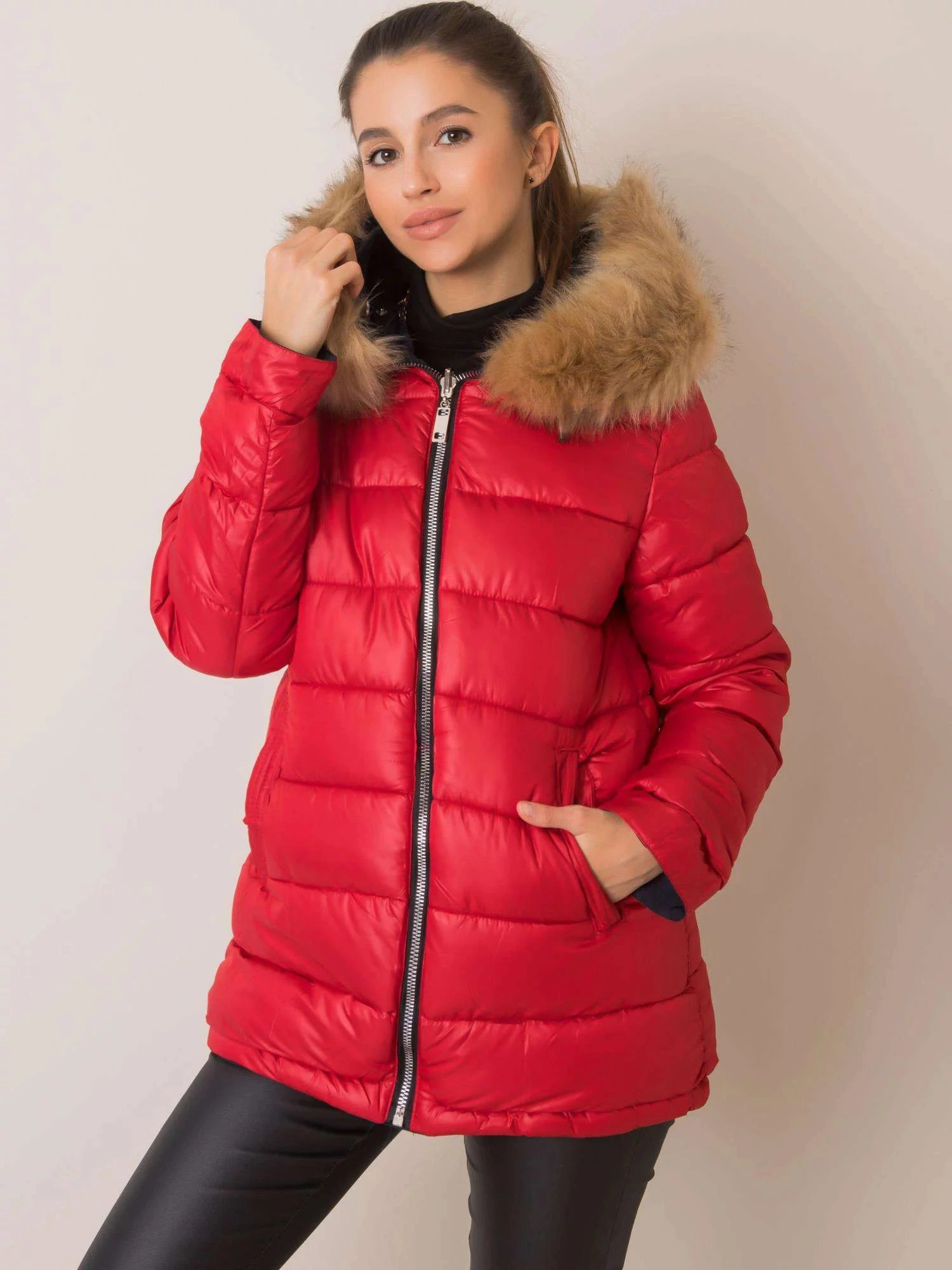 doplňky: zip a druky, stahovací šňůrka v pase, stahovací kapuce, prošívaná podšívka, kapsy, manžety s druky, odnímatelná kapuce, odnímatelná kožešina na kapuci