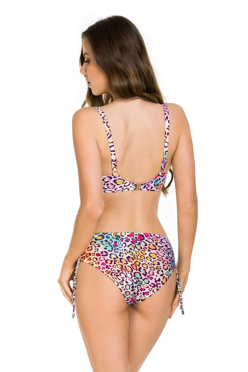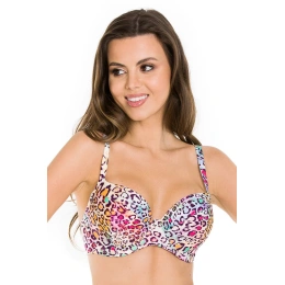 Konstrukci košíčků tvoří síťovina, která nadnáší poprsí a poskytuje mu oporu. Vnější část košíčků pokrývá mikrovlákno s barevným panteřím vzorem. Délku ramínek je možné nastavit. Podprsenka se zapíná na zádech pohodlným háčkem. Pro vytvoření pěkného kompletu doporučujeme komfortní plavkové kalhotky se šňůrkami na bocích.
