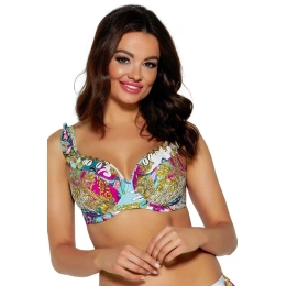 Vícebarevný květinový potisk, barokní ornamenty a ornamentální mozaika vytvářejí dokonalou letní mozaiku, která je kvintesencí půvabu modelu SK 161. Měkké košíčky podprsenky obepínají ňadra, zvedají je a shrnují k sobě, zatímco éterický volánek stoupající od můstku přes horní část košíčku až k ramínku dodává mladistvý půvab. Podél výstřihu padají zlaté řetízky navíc zdobené půvabnými mušlemi, takže SK 161 je plážovým doplňkem. Nezapomeňte sadu doplnit koketními mosazemi s volánky SF 161/11/B!