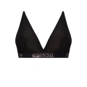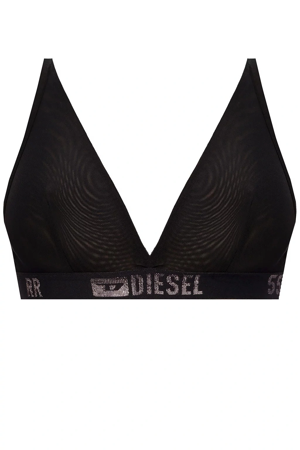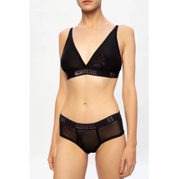 Černá podprsenka od Diesel. Tento styl je vyroben z poloprůhledné síťoviny a je vybaven elastickým spodním páskem zdobeným logem štítku vyšívaným stříbrnou lurexovou přízí.