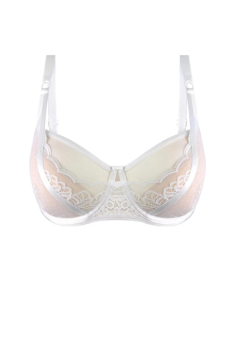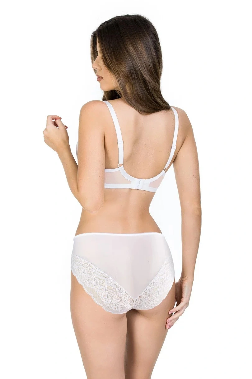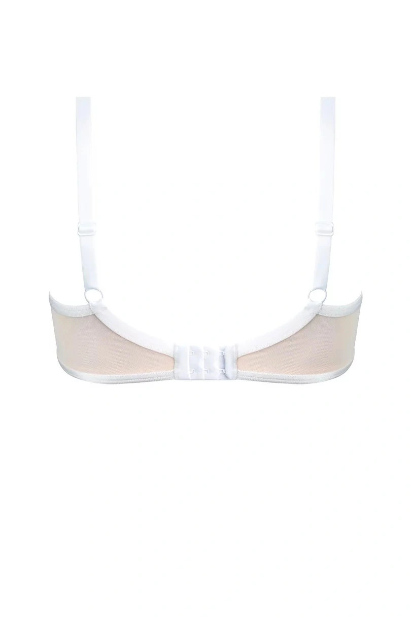 Vnitřní strana košíčků je opatřena měkkou, pokožce na dotek příjemnou pěnou. Vnější stranu halí krajka dodávající podprsence jedinečný vzhled. Horní linie košíčků je z lehkého tylu, elegantně prodloužená krajka nad nimi přidává podprsence nádech luxusu. Ramínka jsou nastavitelná, neodnímatelná. Díky elastickému obvodu bez svislých výztuh je tato podprsenka mimořádně pohodlná i při celodenním nošení. Zapínání na klasické háčky na zadní straně.