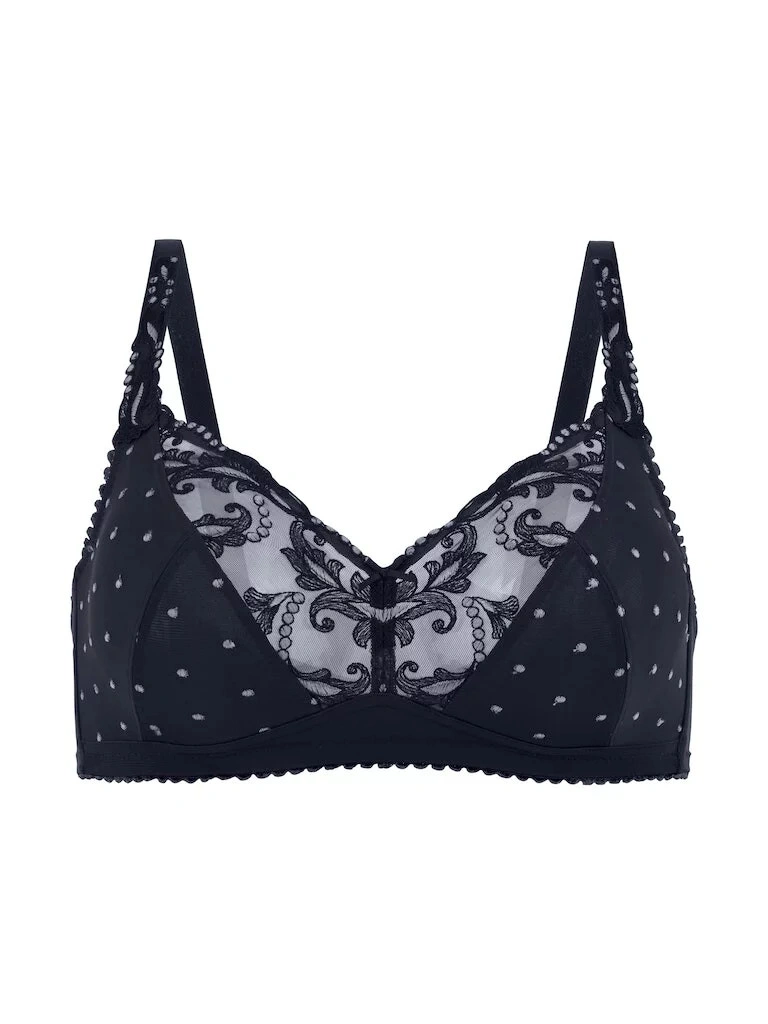 Měkké košíčky podprsenky se přirozeně tvarují a zároveň poskytují pohodlí po celý den. Design obsahuje průhledné vsadky s nádhernou výšivkou na přední straně, které dodávají nádech elegance a jemně zvýrazňují poprsí. Celou podprsenku zdobí jemný puntíkovaný vzor, který dodává styl i praktičnost pro každodenní nošení.
