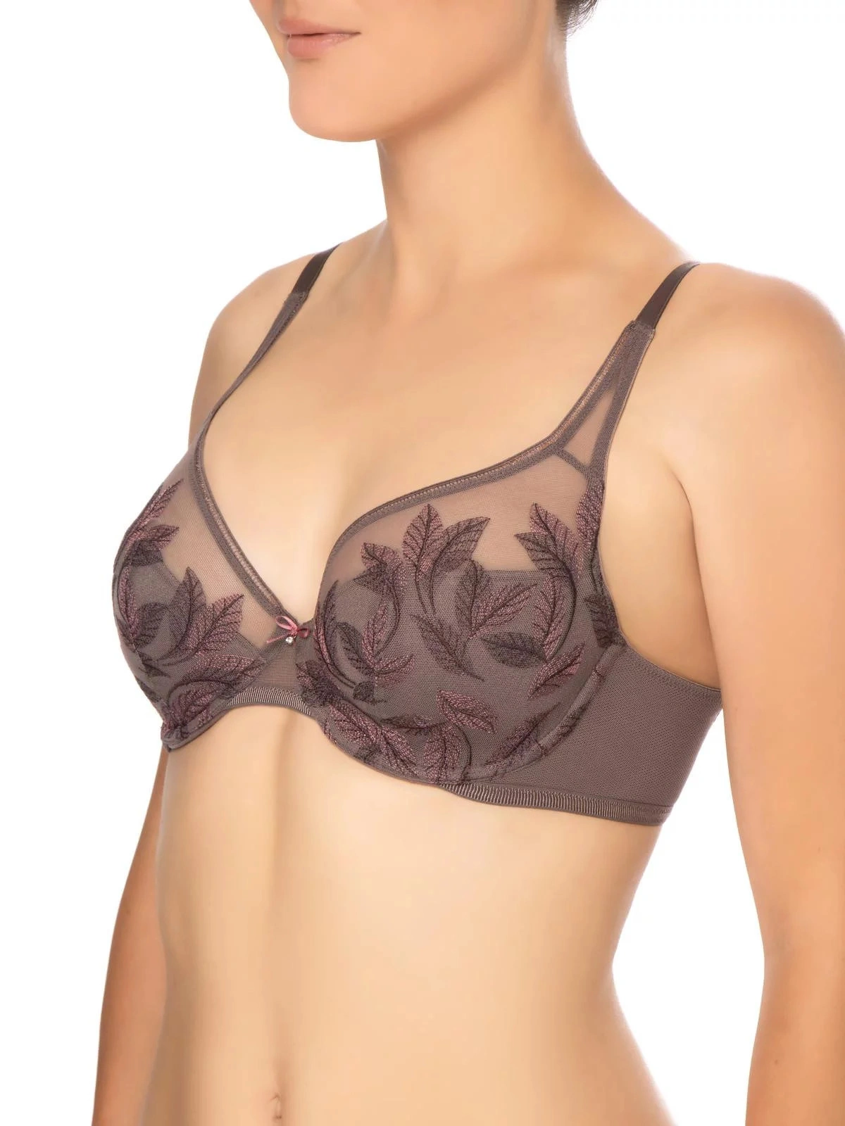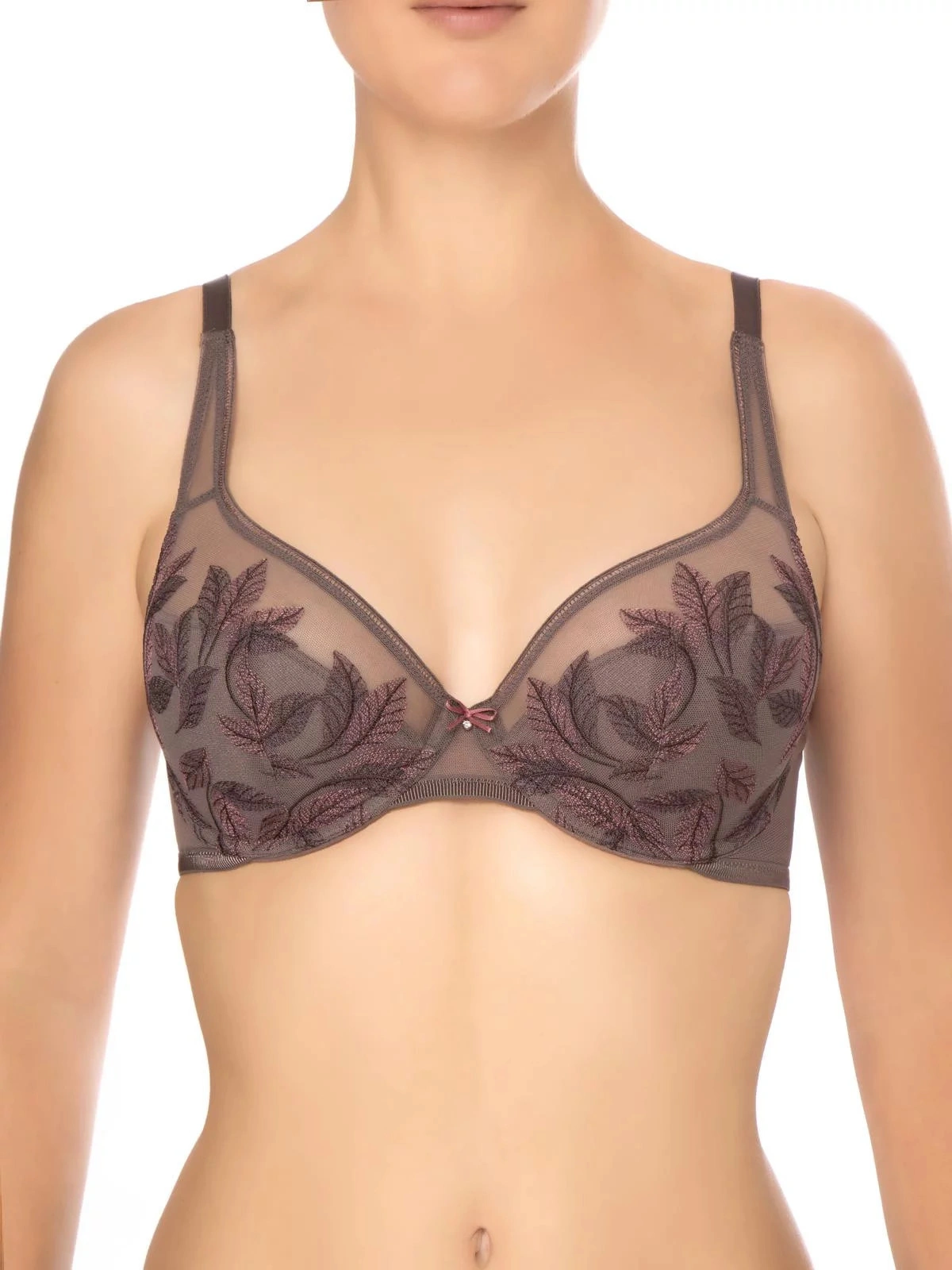 Dvojitě tvarované košíčky z nejkvalitnějšího tylu zvýrazní poprsí a vertikální střih ho dokonale zvedne. Vnitřní část košíčků tvoří jemná zpevňující pěna. Našitá rostlinná výšivka v odstínech hnědé a opalizující mědi mu dodává modernost.