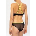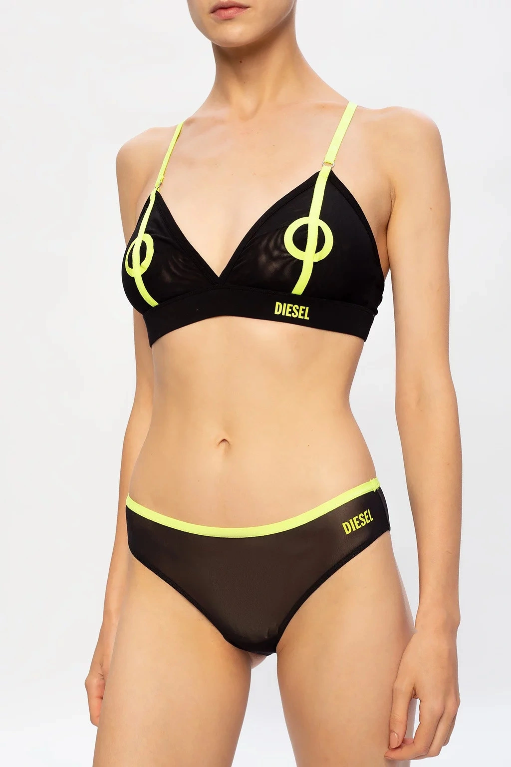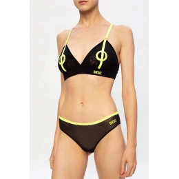 Černo zelená podprsenka značky Diesel. Tento model je vyroben z poloprůhledné strečové textilie a má vyšívané ramenní popruhy s logem, ramínka jsou výškově nastavitelná.