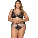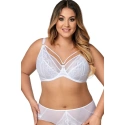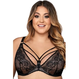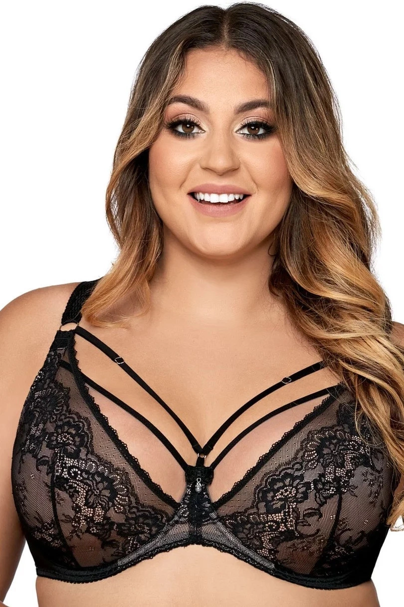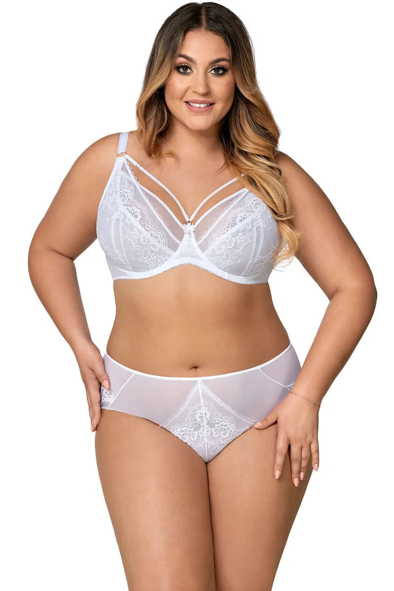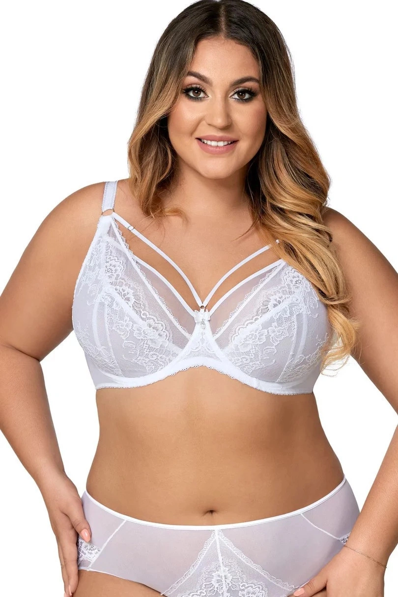 Krásný model měkké podprsenky z krajkové tkaniny. Košíčky i jejich střed zdobí krajka a jemná síťovina. Vrchní linii dekoltu lemuje černý pásek. Mezi košíčky vyniká ozdobná mašlička s přívěskem. Ramínka lze libovolně regulovat, nemůžete je však odepínat. Obvod tvoří pružná lycra. Zapínání je řešeno klasickými háčky. Měkká struktura košíčků dodá ňadrům hezký, přirozený tvar. Díky prodyšnosti tkaniny nebudete ani vědět, že na sobě máte podprsenku. Pohodlí zaručuje perfektní střih a maximální promyšlenost tohoto modelu. Ozdobné strapsy v dekoltu mají také možnost regulace.