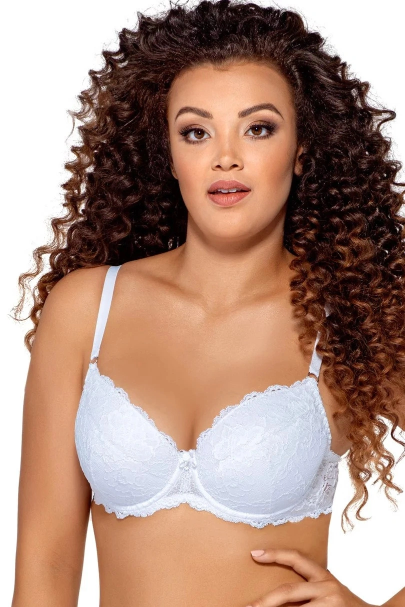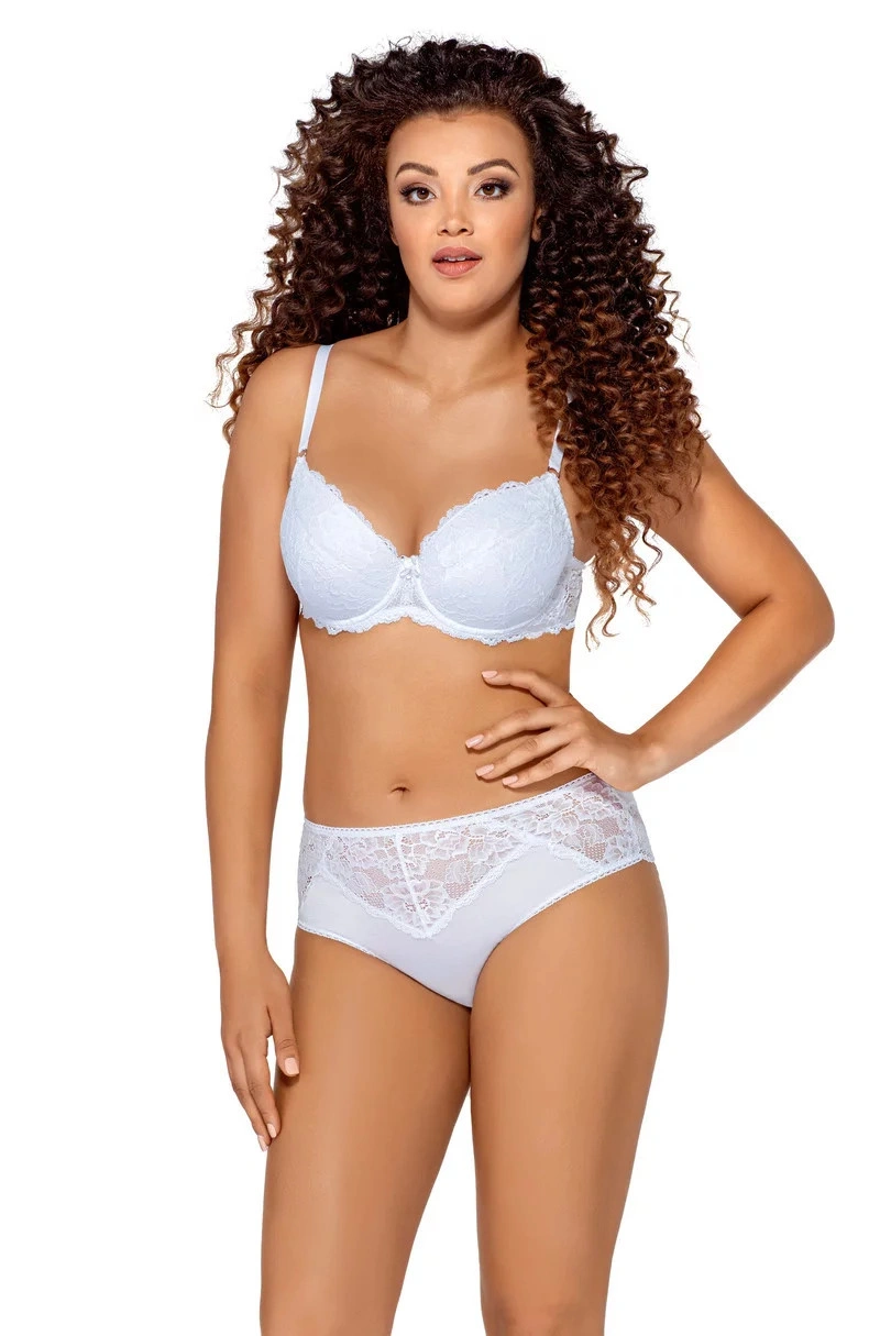 Podprsenka představuje spojení jemnosti a nevinnosti s dokonalou konstrukcí a neocenitelným pohodlím. Tento neobyčejný model typu "push-up" nejenom ideálně obepíná a nadnáší poprsí, ale také jej opticky zvětšuje. Košíčky jsou vyrobené z pěny, jsou pokryté bavlnou a zahalené pěknou lesklou krajkou s květinovým motivem. Ramínka je možné nastavit i odepnout.