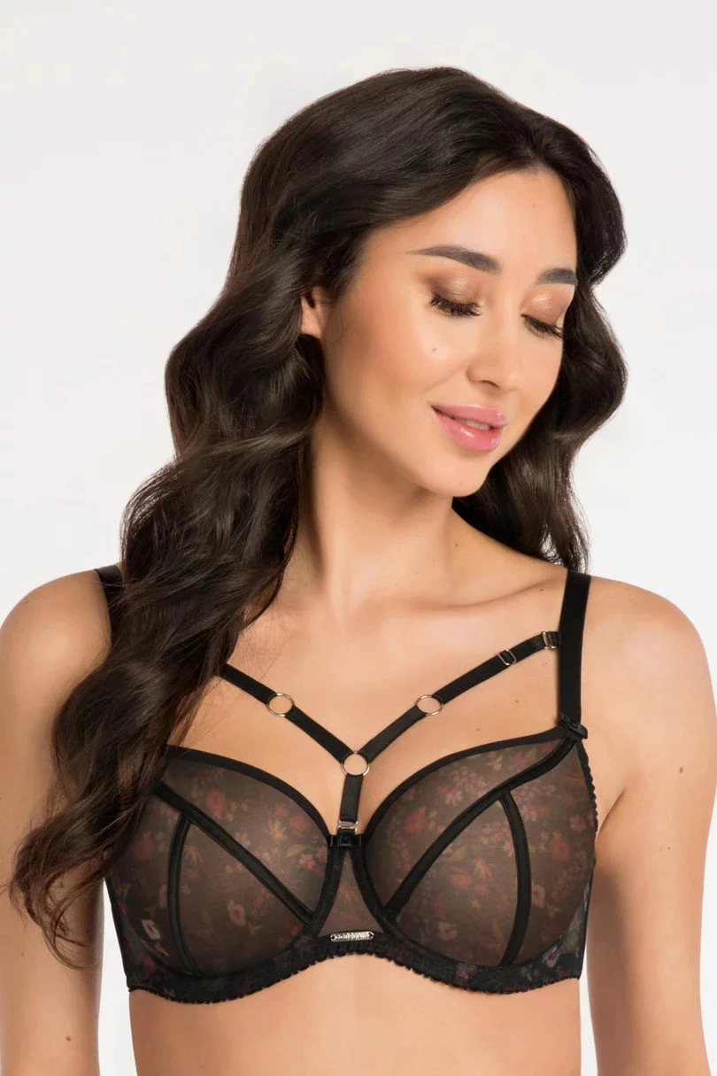 Měkká podprsenka určená pro ženy se středními, velkými a velmi velkými prsy. Poskytuje efekt velmi silného zvednutí a stahování prsou dovnitř, 3dílné košíčky celé z potištěného tylu podšité stabilním tylem. Horní okraj košíčku plynule přechází do pásku. Odnímatelná a nastavitelná ramínka ve výstřihu. Zadní strana je vyrobena z průhledné Lycry, která zajišťuje velmi dobré padnutí a podporu. Boční kostice zabraňují srolování materiálu. Dle velikosti dvou nebo třířadý háček s třístupňovým nastavením obvodu. Neodnímatelná, nastavitelná ramínka ve třech šířkách. Kovové prvky stříbrné barvy.