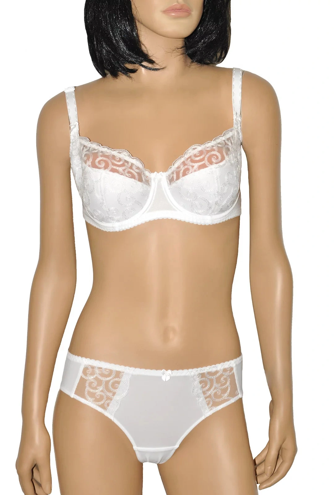 Polovyztužená dámská podprsenka, která je vyrobená z jemné tylové síťoviny ozdobené výšivkou.
