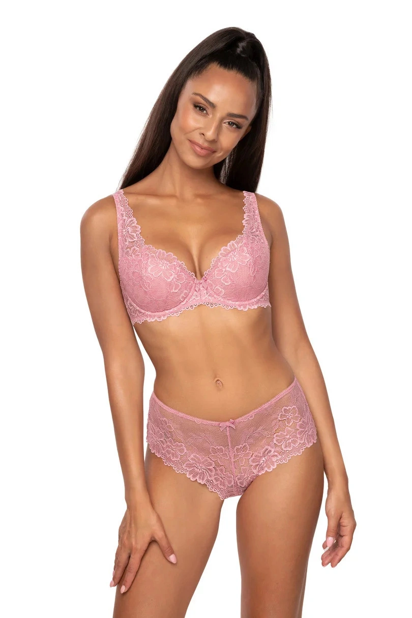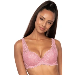 Poloměkká vyztužená krajková podprsenka s květinovým motivem. Vnitřek mísy je vyložen bavlnou. Boky vyztužené svislou velrybí kostí. Ozdobné, nastavitelné popruhy, neodnímatelné. Model dokonale nadnáší a podpírá poprsí.
