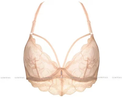 Dámská luxusní podprsenka značky Gorteks z kolekce Charlize. Dokonale řešená, nevyztužená krajková podprsenka s kosticemi. Ramínka jsou pevně všitá, lehce délkově nastavitelná. Mezi košíčky je stříbrná štrasová aplikace s blyštivými kamínky. Na bocích obvodu jsou pružné zpěvňující kostice. Rafinovaně řešenou zadní část podprsenky tvoří krásná krajka na zádech. Zadní zapínání je na dva háčky a tři pozice. K této luxusně vzhlížející krajkové braletce doporučujeme kalhotky brazilkového typu ze stejné série Charlize.