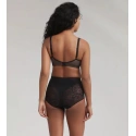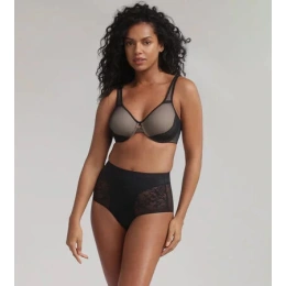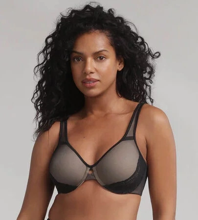 Dámská podprsenka v tělové barvě, potažená černým tylem, na spodní části košíčků našitá luxusní krajka. Ramínka jsou posouvací, zapínaní je na zádech na dva háčky.