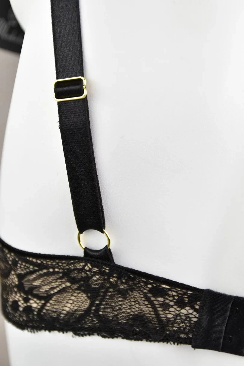 Nastavitelná ramínka, neodepínací, bufet a boky z tylu potaženého krajkou. Obvod zpevněný boční velrybí kostí.