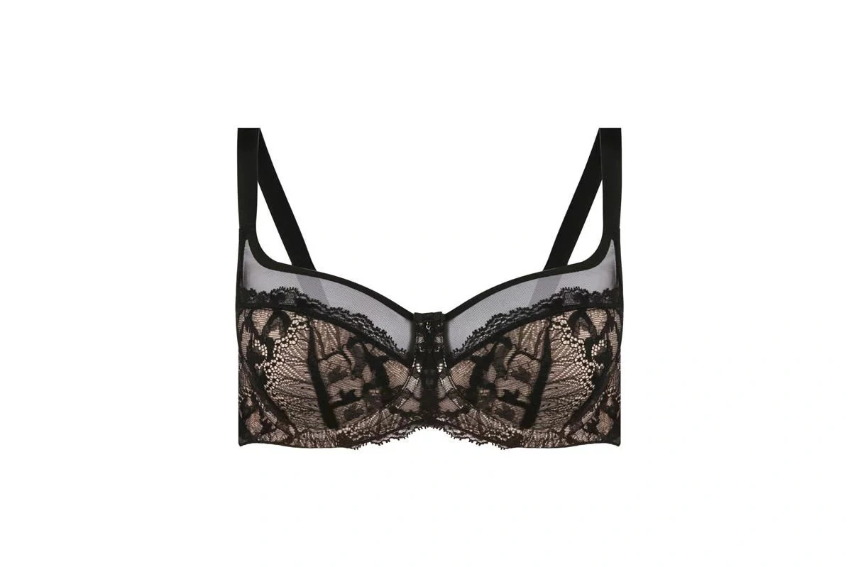 Strukturovaná nevyztužená podprsenka z úpletu a krajky. Tvar, který poskytuje určité krytí.Výstřih d