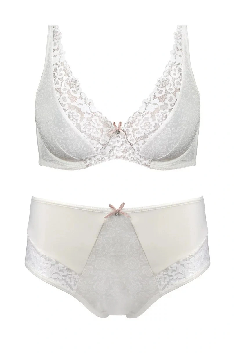 Dekolt zdobí měkká krajka. Košíčky jsou vyrobené z pěkného mikrovlákna v mléčné barvě s jemným vzorem. Po celé délce košíčků se táhne jeden svislý šev. Ve spodní části košíčků je malý záševek. Košíčky jsou vytvarované tak, aby dodávaly poprsí přirozený tvar. Díky použitým materiálům poskytuje podprsenka neobyčejné pohodlí a komfort. Model je vhodný pro ženy s malým a středně velkým poprsím. Široká ramínka jsou pohodlná.