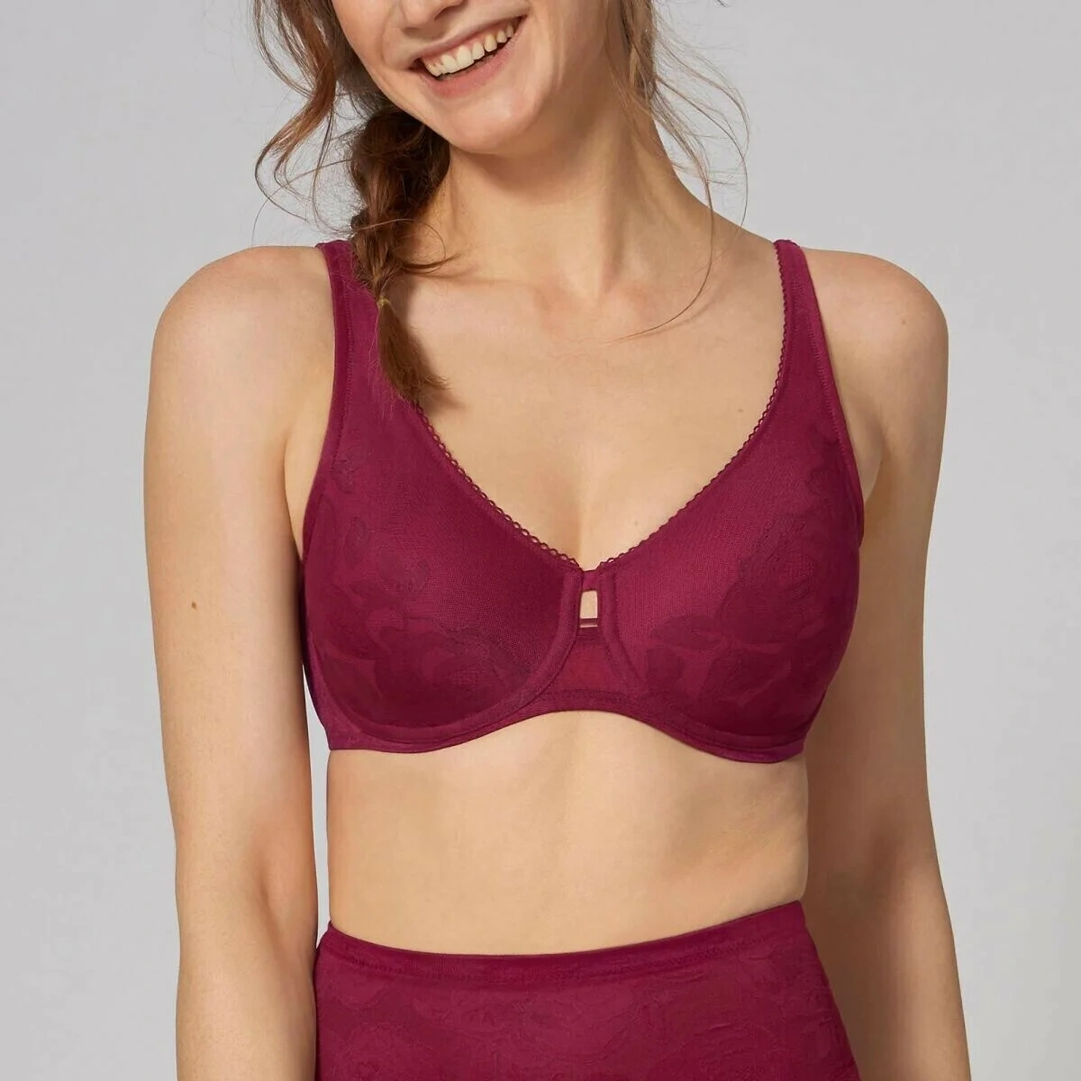 Modelka má na sobě minimalizační podprsenku s kosticemi Flexi ve velikosti 75D.