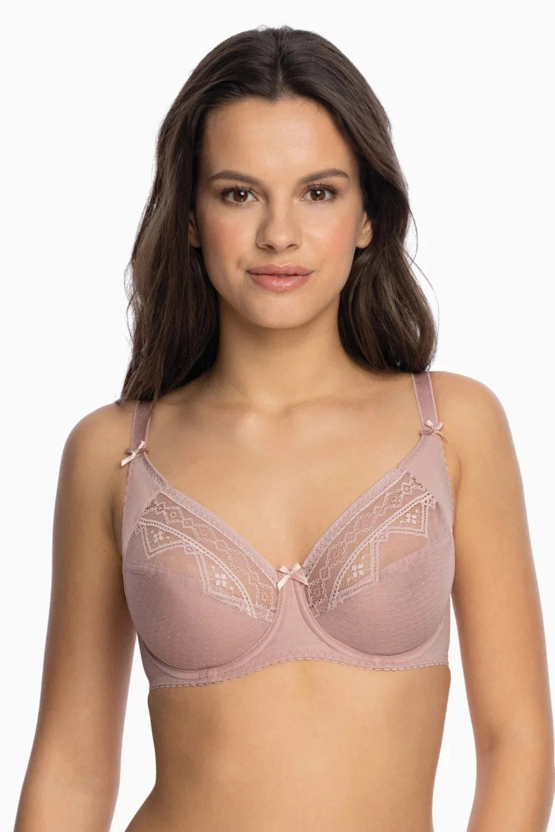 Košíčky jsou vyrobené z krajky s geometrickými vzory. Konstrukce a střih modelu dokonale obepíná a nadnáší poprsí díky bočnímu panelu. Ramínka jsou pohodlná. Obvod podprsenky je zpevněný bočními kosticemi.