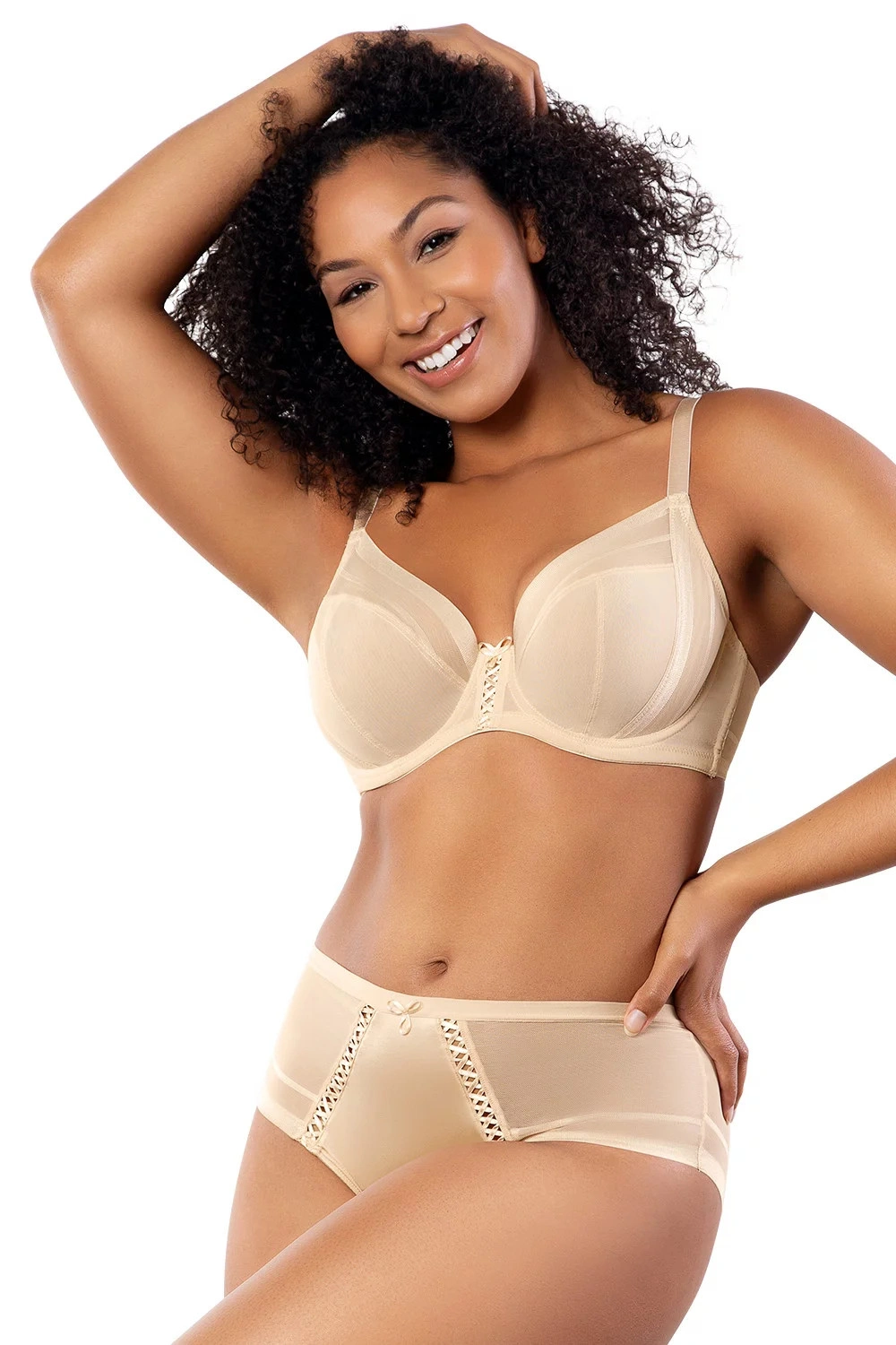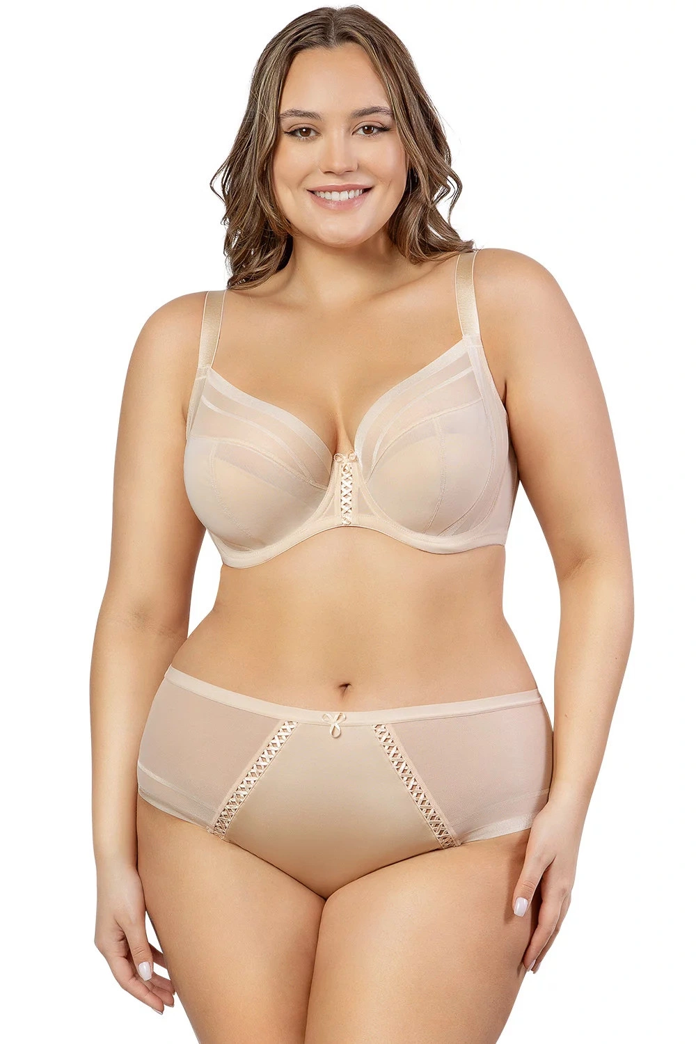Podprsenka od Parfait. Model P6062. Svislé velrybí kosti zasazené po stranách. Výrobek má nastavitelné popruhy bez možnosti odepnutí. Podprsenka se zapínáním na háčky a oči. Upevňovací bod: vzadu. Dvě řady svislých háčků. Tři stupně horizontálních háčků. Výrobek je vyroben z 58 % z polyamidu a 42 % ze spandexu. Boky vyztužené látkou. Bezešvá povrchová úprava okrajů. Výrobek pro ženy.