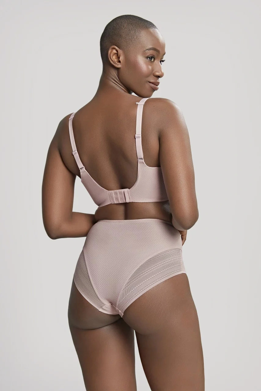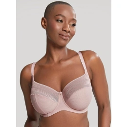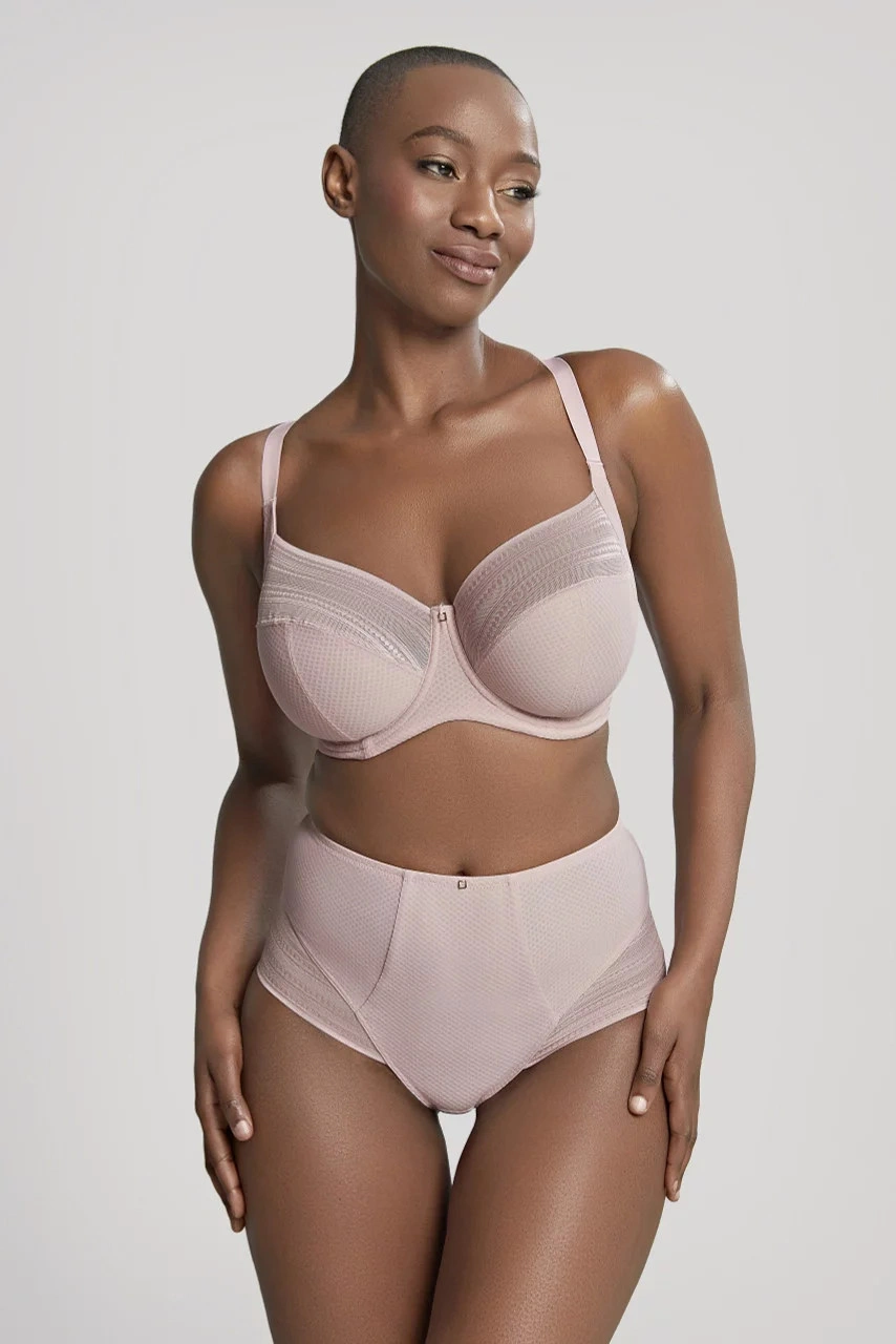 Nevyztužená podprsenka Panache Serene nabízí podobný střih jako naše dlouholetá stálice - podprsenka Envy. Serene vás zaujme jemným geometrickým vzorem, poloprůhledným lemem podél výstřihu a nastavitelnými ramínky, která lze na zádech sepnout do kříže. Má okouzlující elegantní vzhled, košíčky jsou neprůhledné. Košíček je šitý ze 4 částí s horním lemem ze strečové krajky. Boční podpora zaručí, že poprsí nepůjde mimo siluetu postavy. Podprsenka perfektně pozvedne a vytvaruje poprsí i v těch největších velikostech. Zapínání je na zádech vypolstrované pro maximální komfort. Obvod podprsenky má skryté švy a je tak velmi příjemný na těle. V této barvě se podprsenka hodí pod světlé a bílé oděvy. Doporučujeme kombinovat s vyššími kalhotkami ve stejném barevném tónu a s totožnou elastickou krajkou.