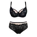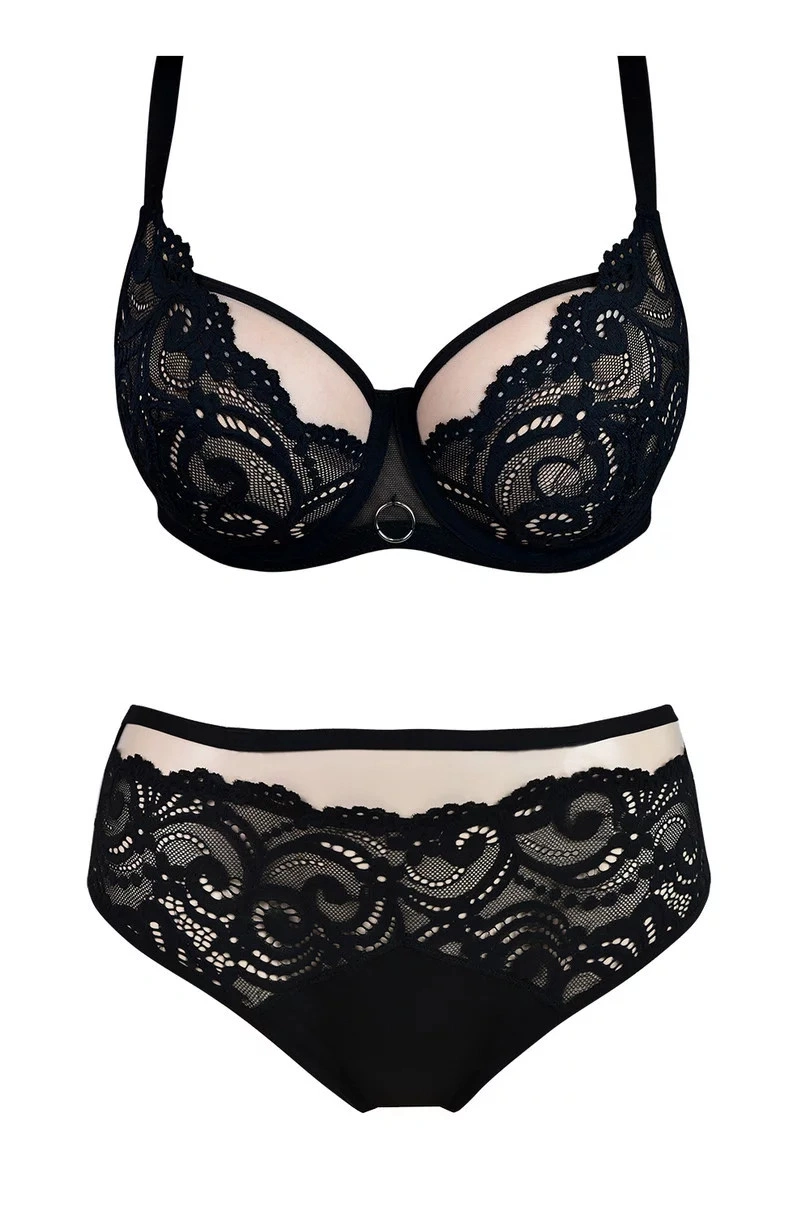 Košíčky modelu jsou ušité z béžové pěny a jejich spodní část pokrývá černá krajka. Vrchní část košíčků tvoří síťovina olemovaná černou lemovkou. Střih a konstrukce modelu dokonale nadnáší poprsí. Díky tomu je podprsenka pohodlná a komfortní. Můstek modelu zdobí kolečko ve stříbrné barvě.