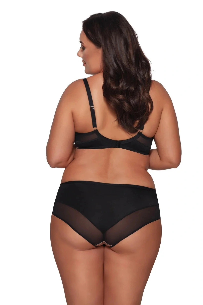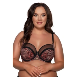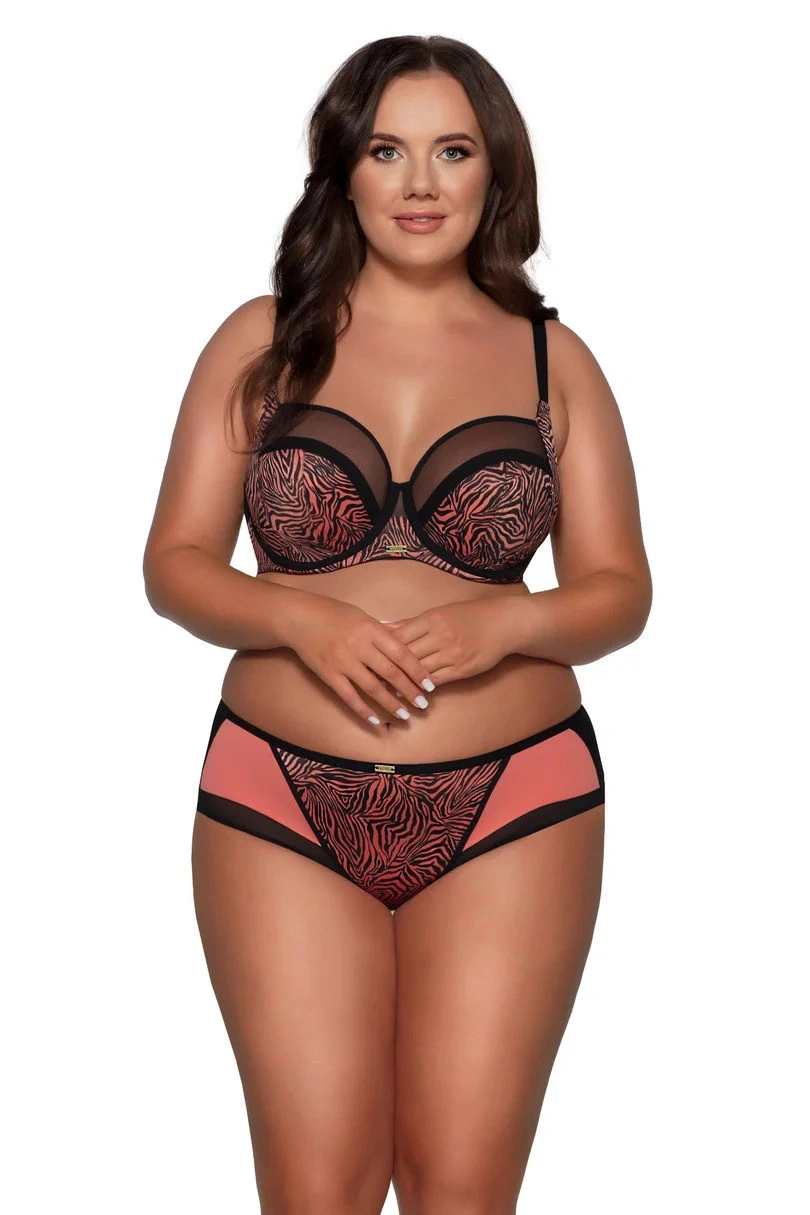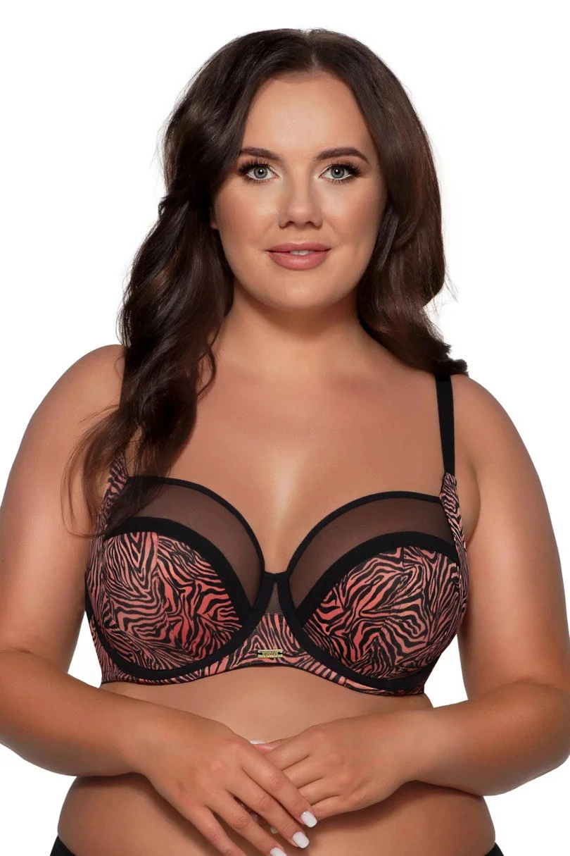 podprsenka 1130/3 TIGER byla navržena pro ženy s většími poprsí a nabízí jak oporu, tak stylový vzhled. Košíčky jsou vyrobeny z jemné pleteniny zdobené tygřím potiskem, který jim dodává výrazný a agresivní vzhled. Průsvitná síťovina, decentně zakončená elastickým lemem, dodává podprsence nádech lehkosti a elegance a vytváří smyslný efekt.