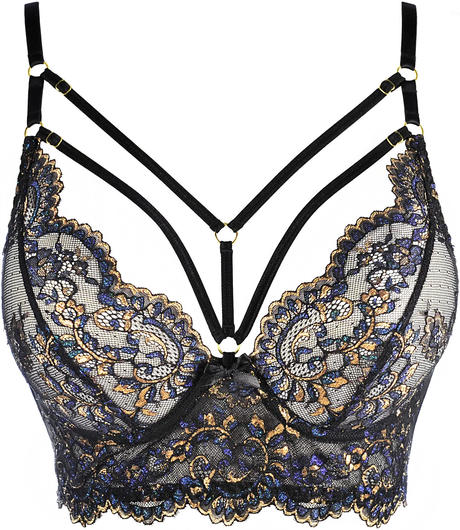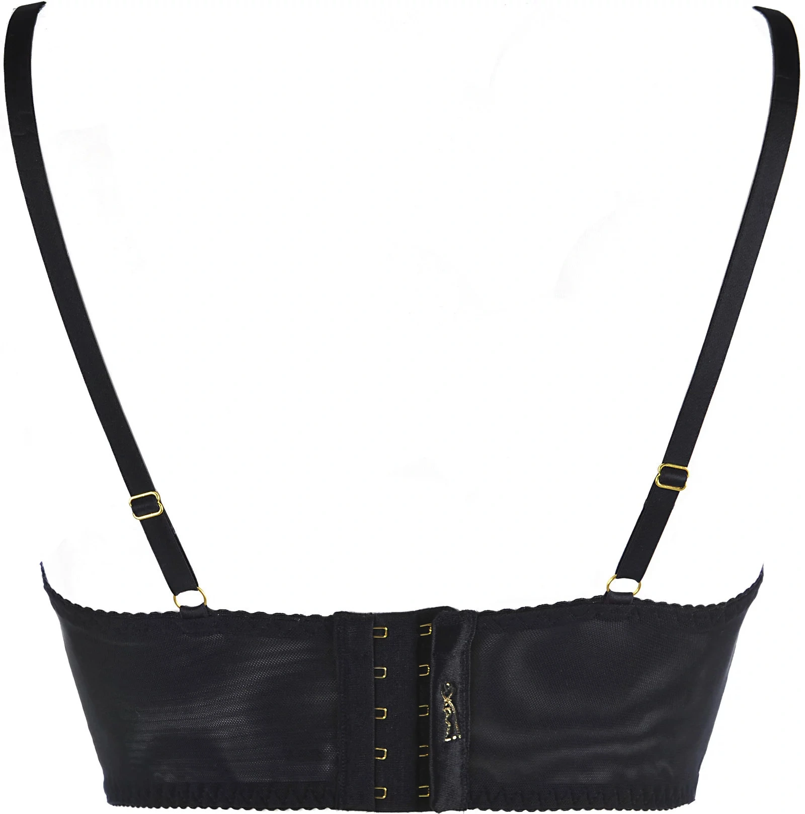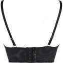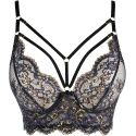 Měkký polokorzet z krásné třpytivé krajky zvýrazní a pozvedne vaše prsa v klasickém stylu, aniž by zakryl jejich přirozenou krásu. Polokorzet je vhodný pro každodenní vycházky i neobvyklé příležitosti s tmavým oblečením. Má zlaté obruče na spojených řemíncích, které jsou neodnímatelné, ale nastavitelné. Zadní díl tohoto modelu je tylový, ale širší a zapíná se na pětiřadový háček. Ve střední části poprsí je mezi košíčky systém pásků spojených kroužky ve zlaté barvě.