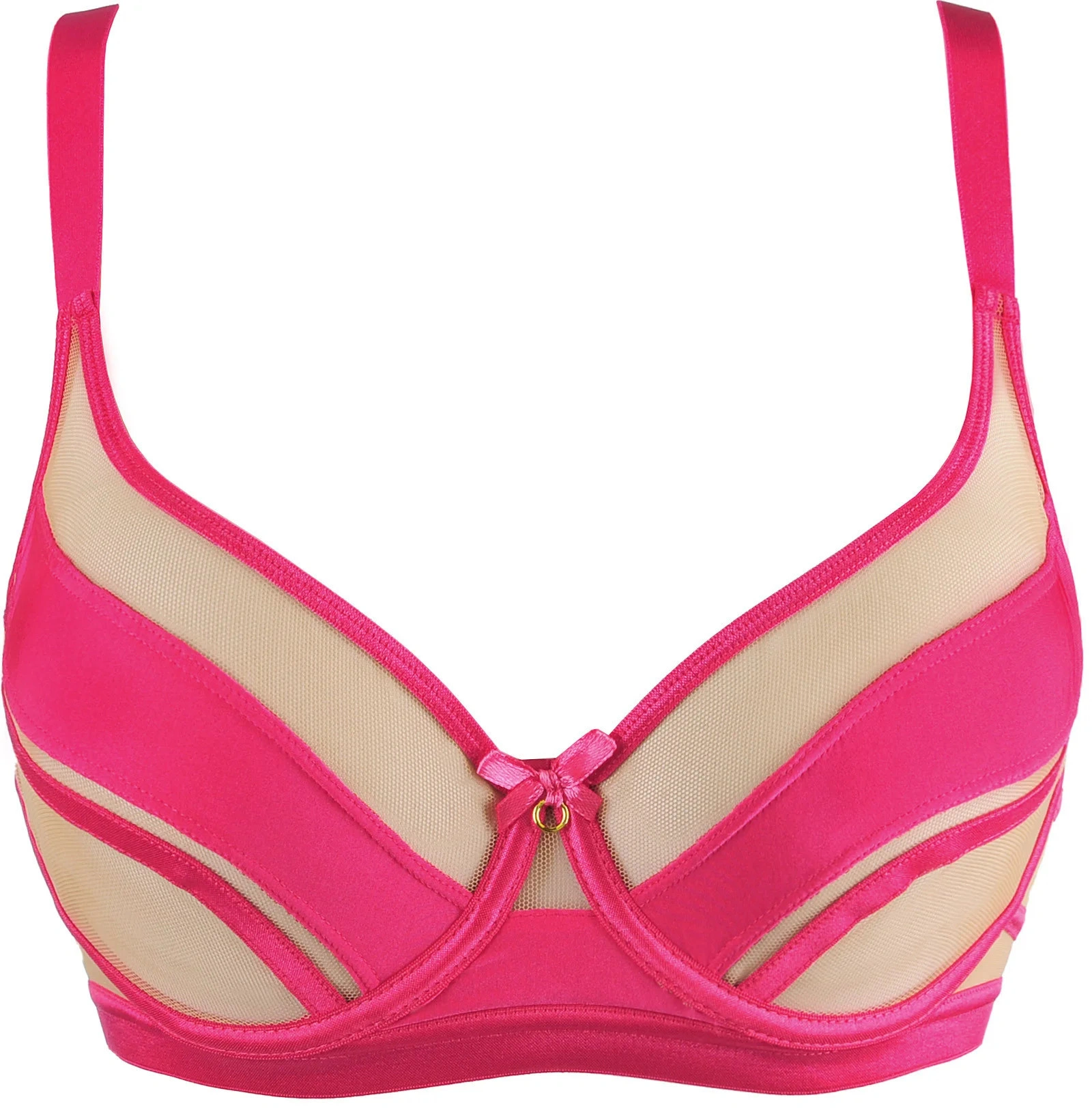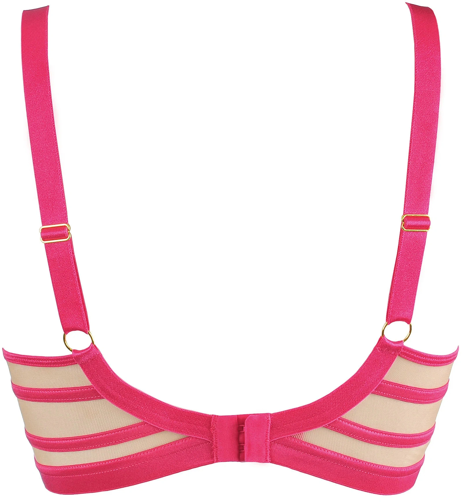 Měkká podprsenka, která kombinuje jedinečný design s klasickým střihem. Pevný béžový tyl v kombinaci s mikrovláknem se dokonale přizpůsobí tělu pro maximální pohodlí, zatímco energická růžová barva dodává sebevědomí a je doplněna zlatými doplňky. Podprsenka se zapíná na dvojitý háček a ramínka jsou nastavitelná a neodnímatelná, aby odpovídala velikosti.