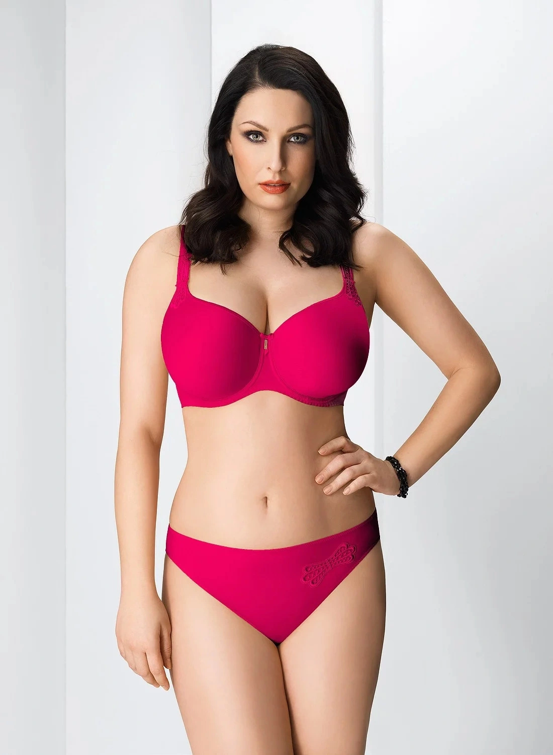 Vyztužená podprsenka s hladkými košíčky se všitou jemnou krajkou ve výstřihu do velikosti E. Zapínán