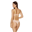 Béžová podprsenka se zajímavou výšivkou. Jemná výšivka s barevným květinovým vzorem. Měkké košíčky, částečně průhledné. Svislé boční velrybí kostice stabilizují obvod podprsenky. Zadní část podprsenky je vyrobená z tylu. Uprostřed ozdobná zelená mašlička. Podprsenka navržena a ušita v Polsku.