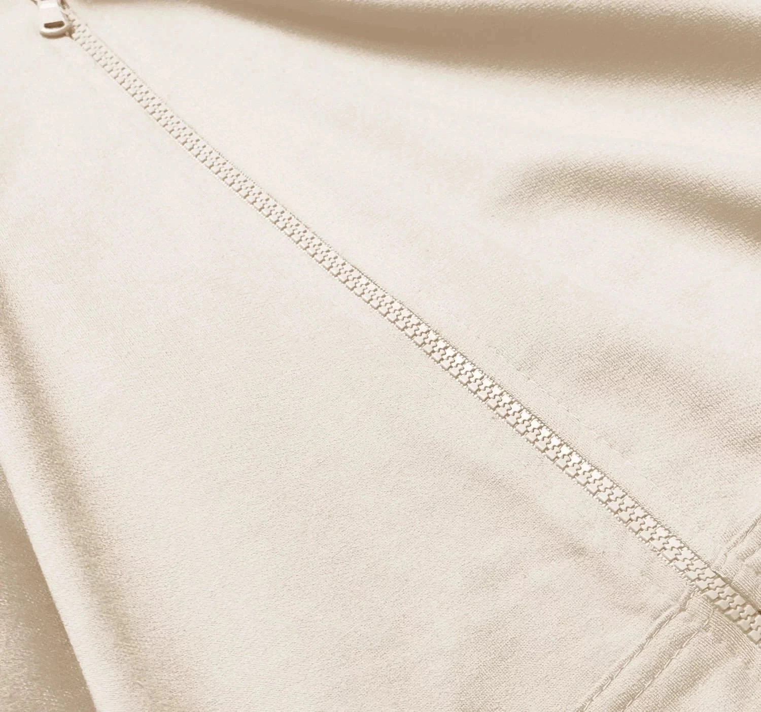 Mikina má volný střih, délku k bokům a zapíná se zipem. Model má dvě kapsy. Rukávy a spodní okraj mikiny jsou olemované stahovacími lemy.