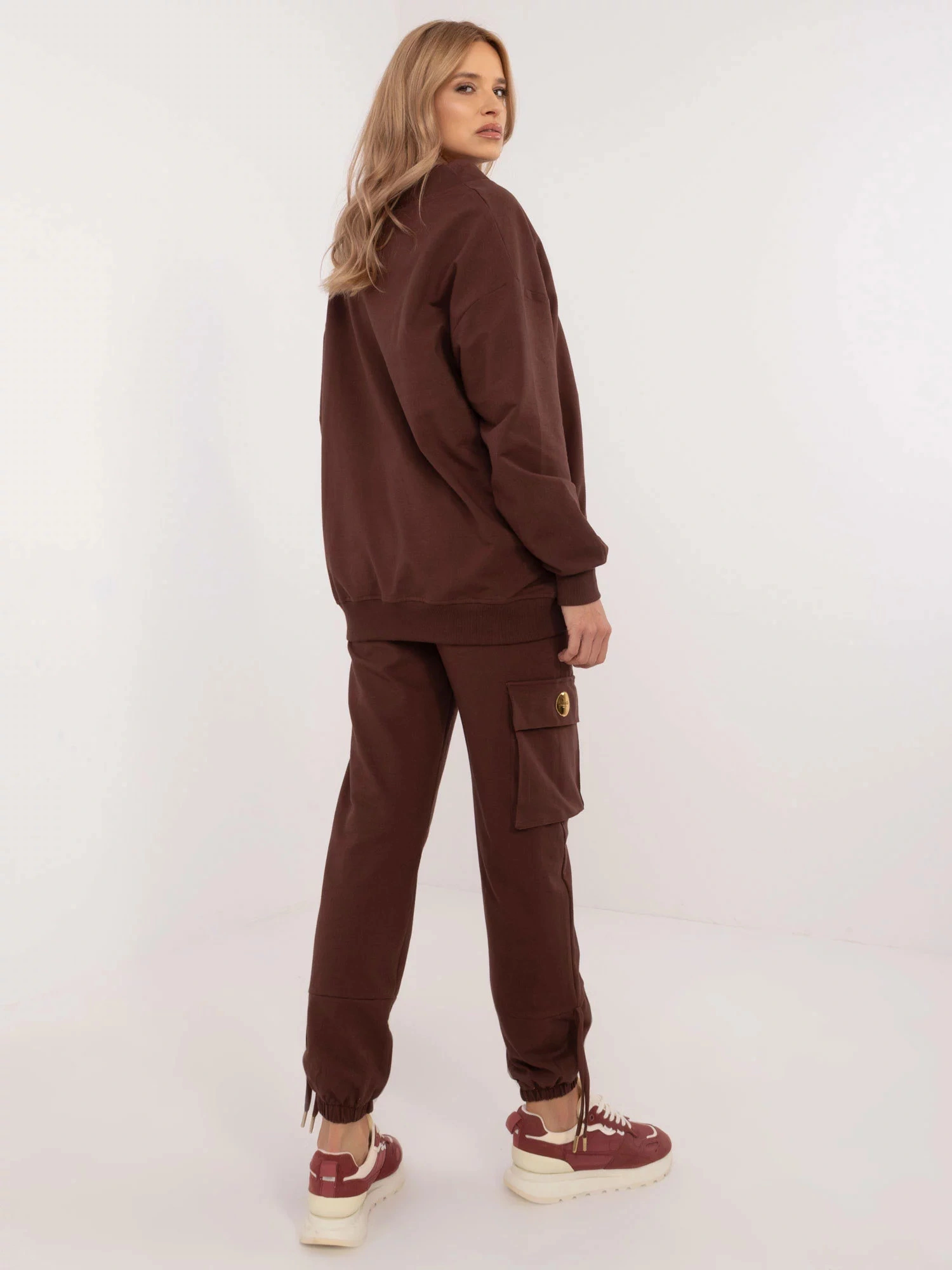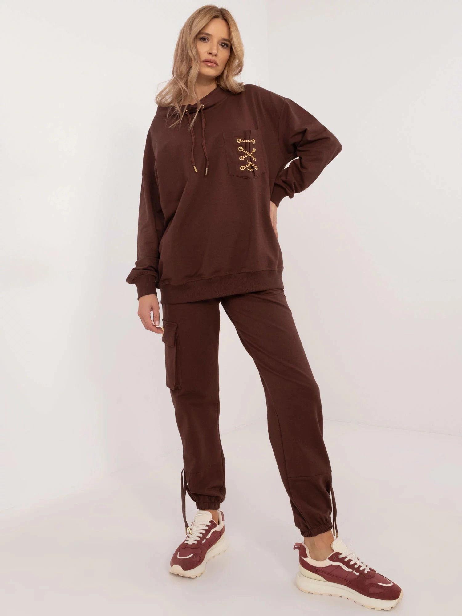 Dámský teplákový set se zlatými ozdobami na vrchním díle. Dlouhý rukáv, dlouhé kalhoty.
