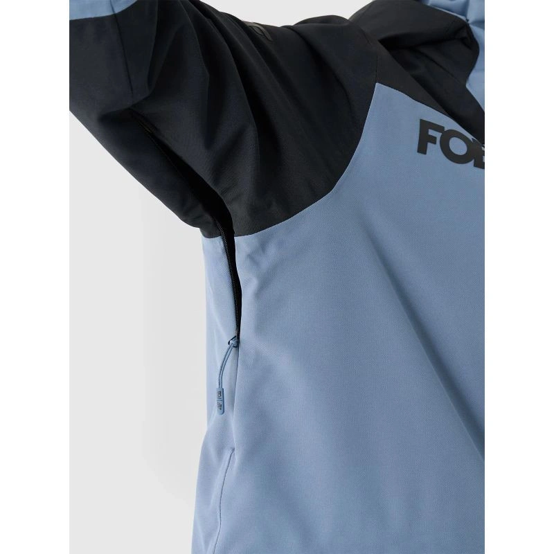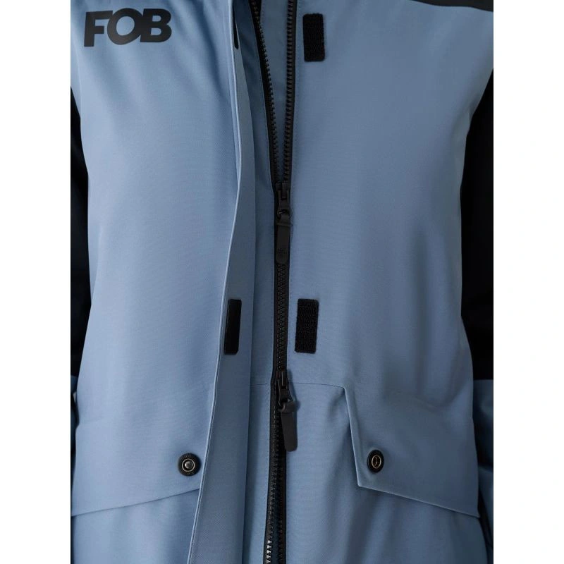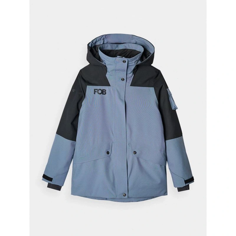 Damska kurtka snowboardowa z membraną jest wyposażona w zintegrowany kaptur z profilowanym daszkiem oraz regulacją objętości i głębokości. Szyję osłania wysoki kołnierz ocieplony miękkim trykotem, który dodatkowo zabezpieczy przed chłodem i wiatrem. Rękawy zakończone są mankietami z regulacją na rzep. Przedłużone wewnętrzne elastyczne mankiety z otworami na kciuki osłonią nadgarstki i dłonie przed zimnym wiatrem. Pod pachami umieszczono wentylację zapinaną na jednokierunkowy zamek kryty pod plisą, który daje możliwość regulacji przepływu powietrza. Po bokach znajdują się 2 kieszenie zapinane na zamek. Natomiast w środku znajduje się otwarta kieszeń na gogle, która wykonana jest z elastycznej siateczki. Co więcej, wewnętrzna kieszeń z zamkiem pozwoli na bezpieczny transport cennych przedmiotów, np. telefonu. Na lewym ramieniu jest niewielka kieszonka z zapięciem na rzep oraz kieszonka ski pass z zapięciem na zamek, która pomieści karnet narciarski lub inne drobiazg