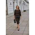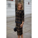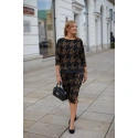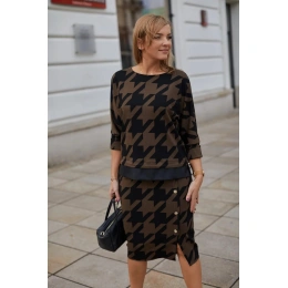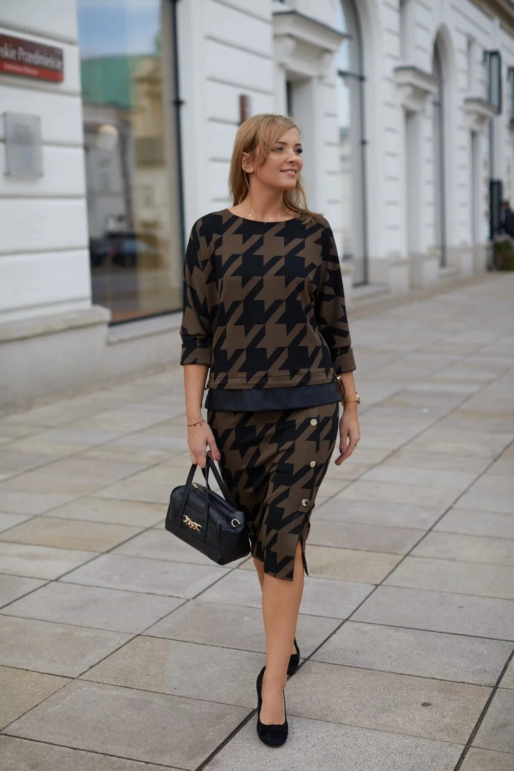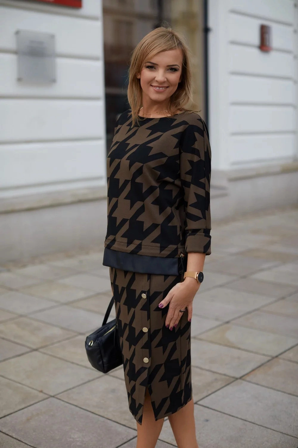 Tato dvoudílná dámská souprava si získala srdce našich zákazníků. Top je celý vyrobený z měkkého žakárového úpletu a má podobu kimona s širšími ohrnutými rukávy. Mírně vypasovaná sukně se zlatými knoflíky dodává módní nádech. Díky široké gumě všité do pasu se sukně dokonale přizpůsobí postavě majitelky. Halenka je zdobená koženým lemováním. Na atraktivitě přidávají také ozdobné kovové zátky ve spodní části halenky. Tento promyšlený střih poskytuje pohodlí ženám všech velikostí. Bez podšívky.