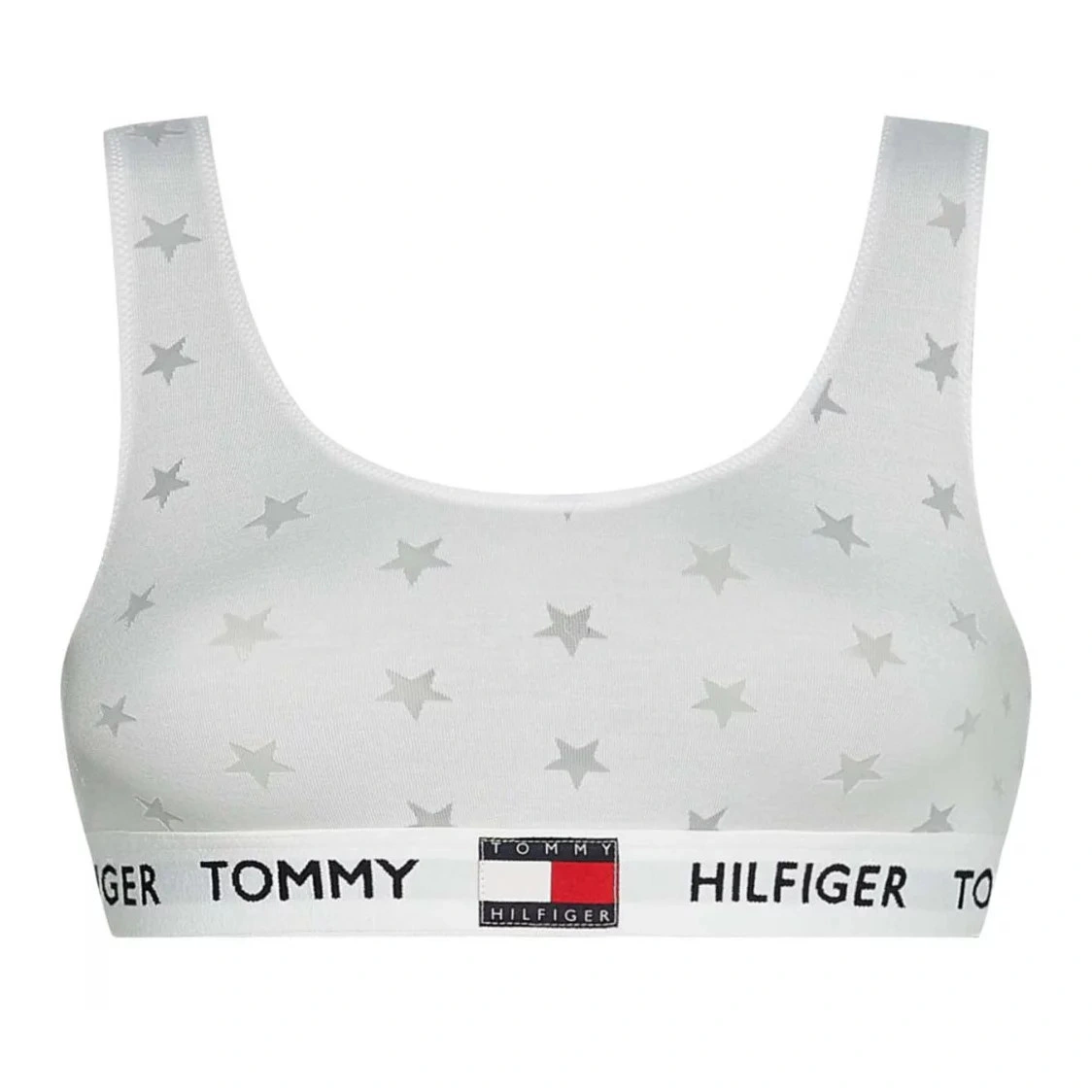 Tommy Hilfiger sportovní podprsenka je nevyztužená a disponuje gumou na spodní části lemu s logem značky. Tento model je zdobený hvězdičkami, což dodává podprsence stylový a moderní vzhled.