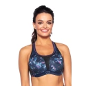 Polstrovaná konstrukce založená na podpůrné kostici se osvědčí i v extrémních podmínkách. Košíčky jsou vyplněné tenkou jemnou pěnou a podšité síťovinou pohlcující vlhkost, což maximalizuje funkčnost a pohodlí podprsenky. Široké popruhy s otvíráním na zádech jsou podšité měkkou pěnou a záda jsou vyztužená stabilní recyklovanou tkaninou. Veškeré výztužné pásky jsou schované uvnitř, což podprsence dodává estetičtější vzhled. Design je v odstínu klidné námořnické modři, posetý ženskými barvami, a výstřih je dále zvýrazněn fuchsiovým lamów.