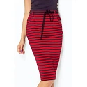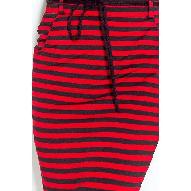 Delší elastická sukně s kapsami a ozdobným páskem. Vzadu má zapínání na zip. Je šitá z příjemného materiálu s červeno-černými pruhy.