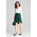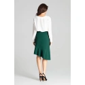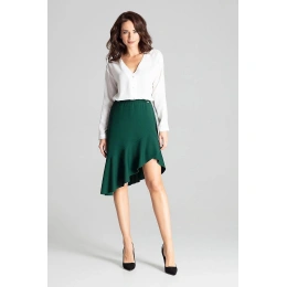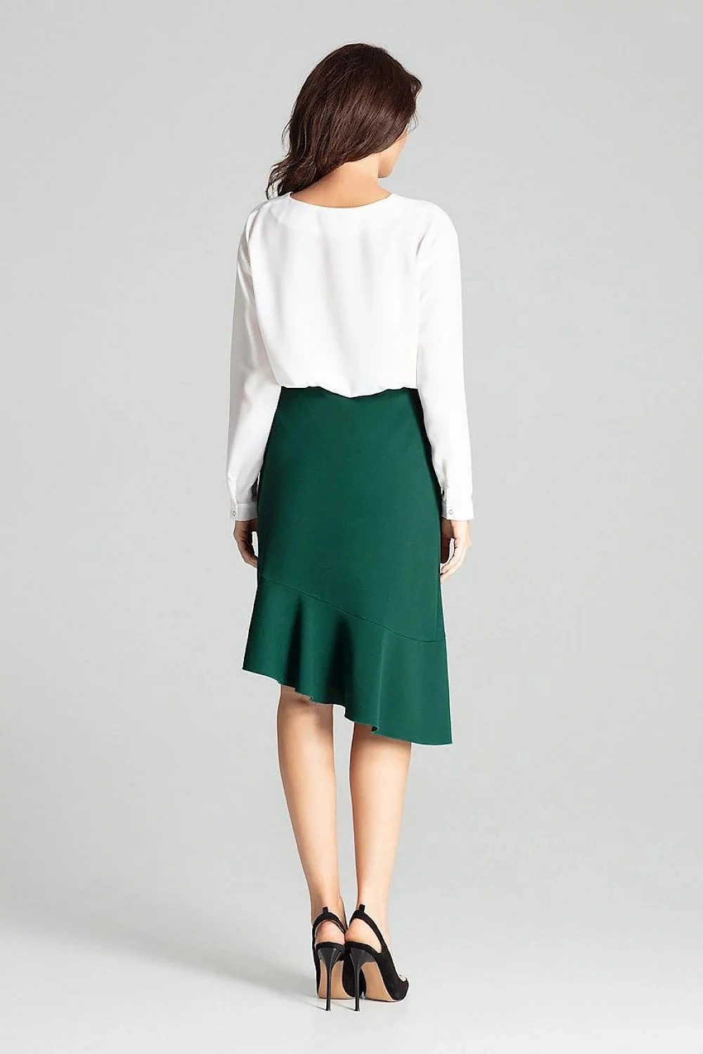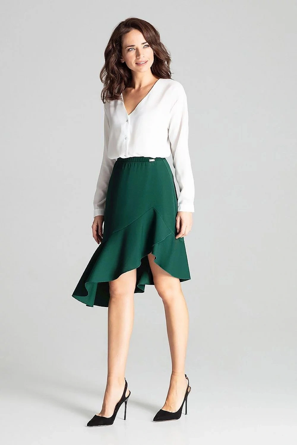 Tmavě zelená asymetrická midi sukně s volánem. V pase je všitá široká guma. Bez podšívky a bez kapes.