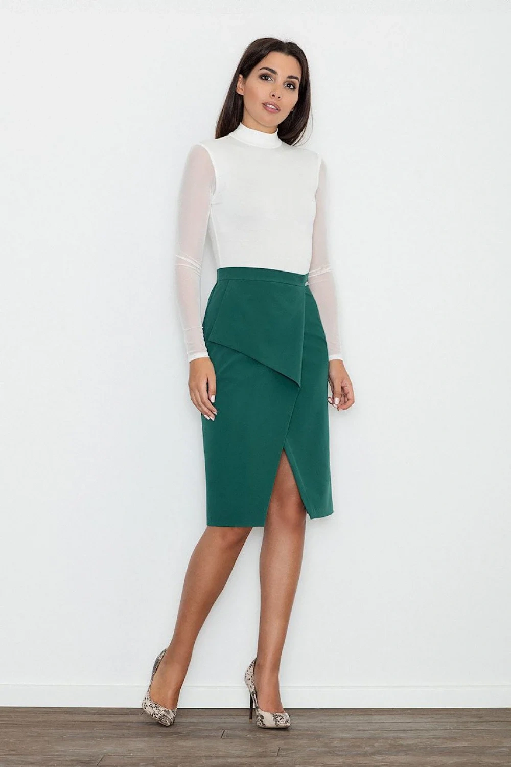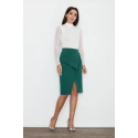 Přiléhavá tužková sukně, volný zavinovací top s dlouhými rukávy a páskem pro dotvoření efektu. Tyto