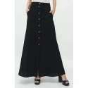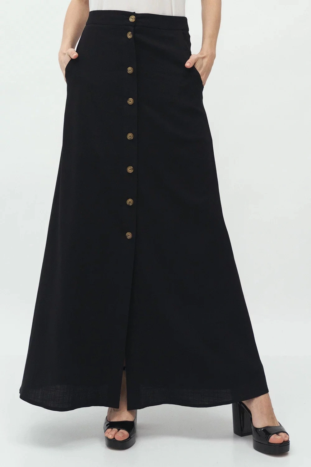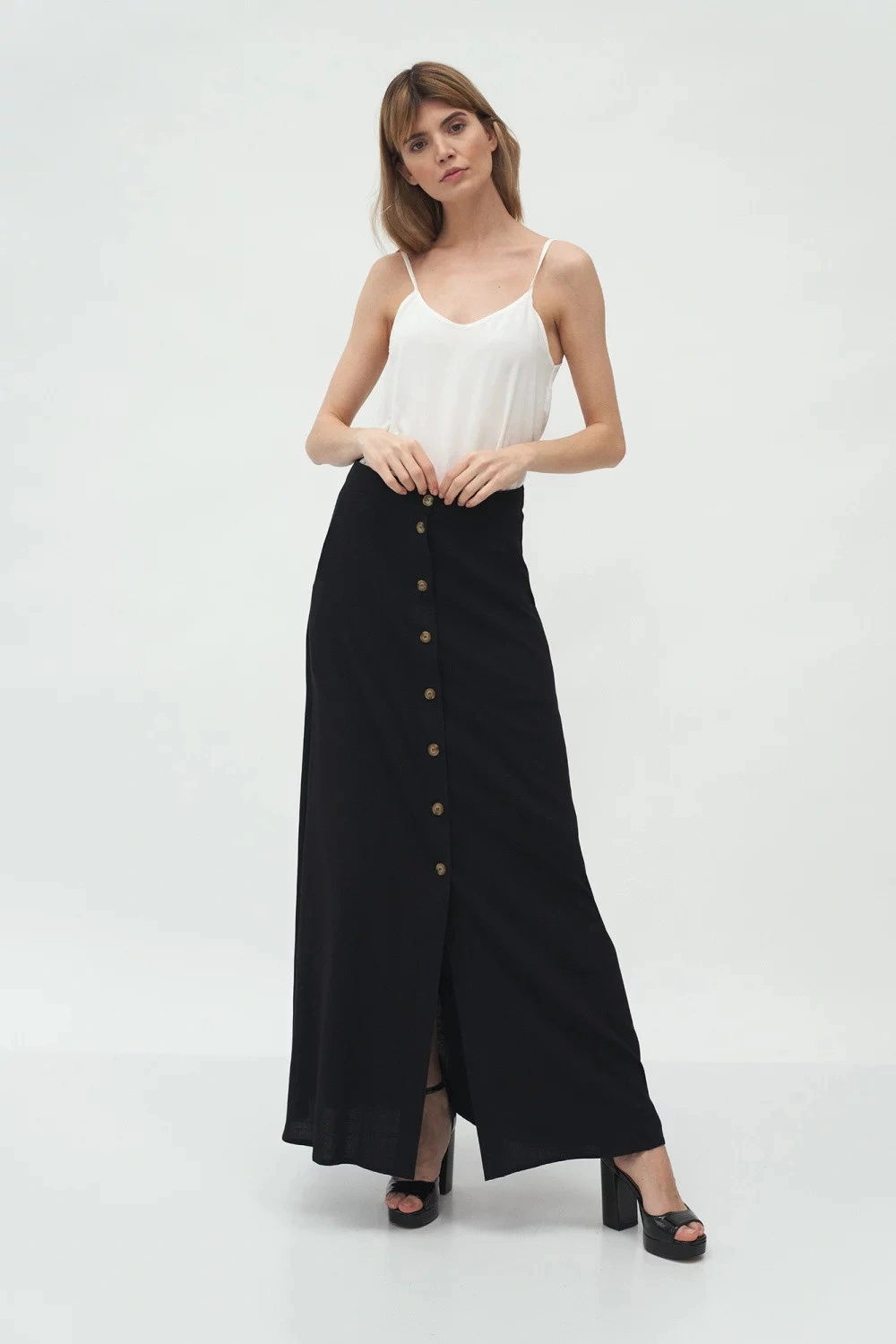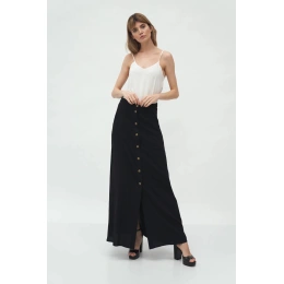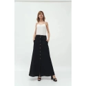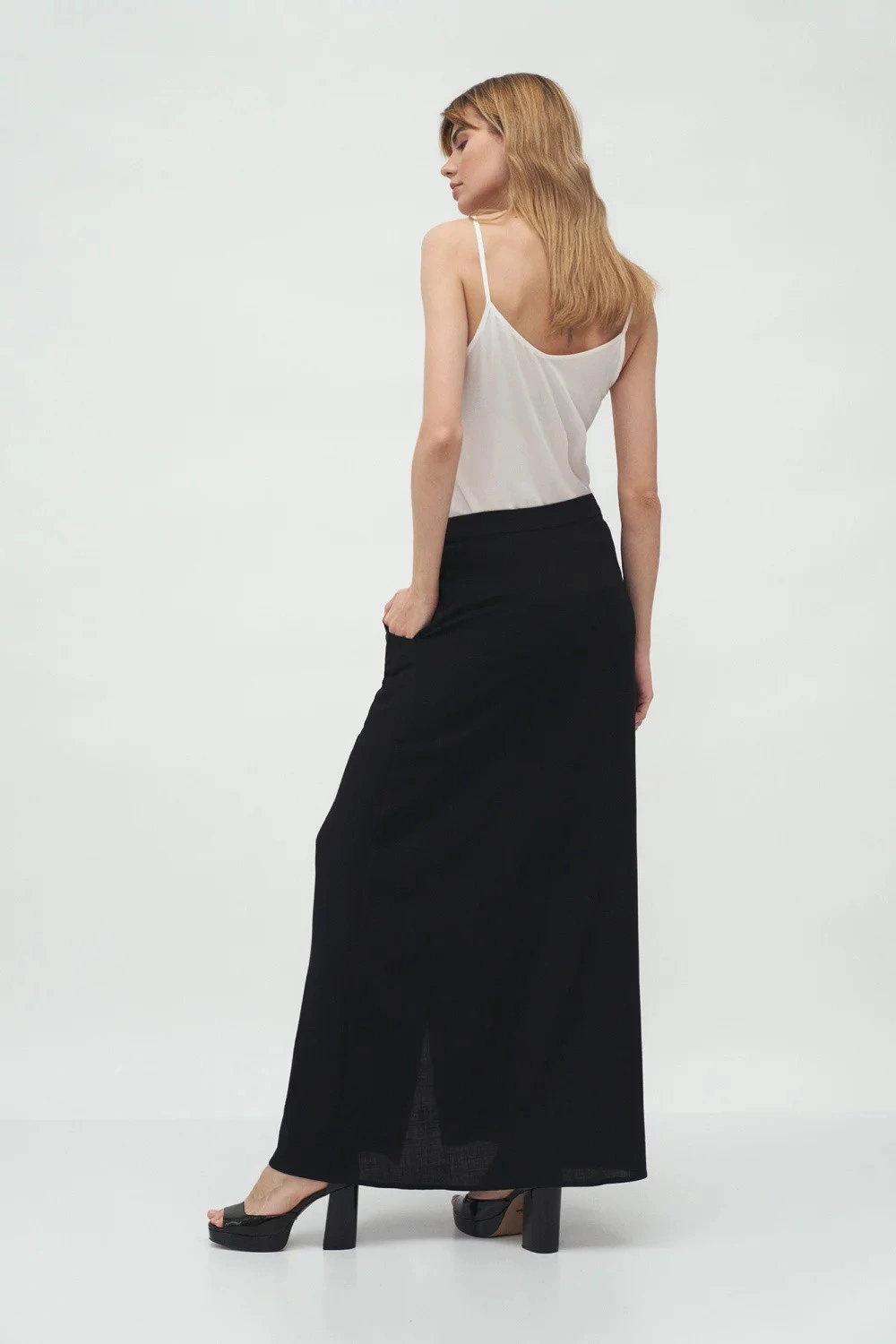 Kalhoty se zvýšeným pasem a zipem na boku. Skryté kapsy v šikmých švech. Kalhoty z tmavě modrého lnu