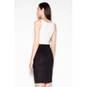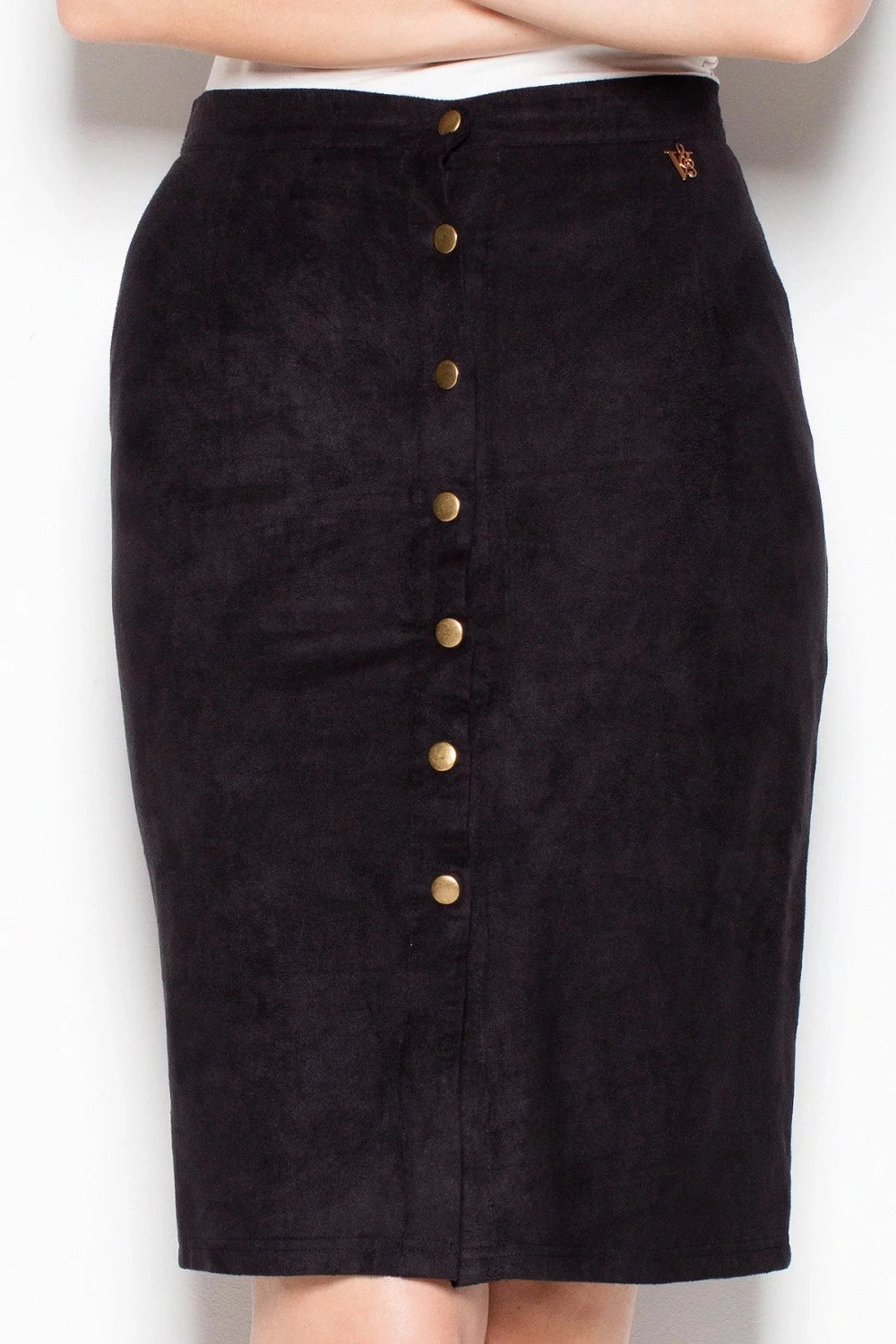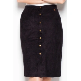 Módní tužková sukně v midi délce ze semiše. Charakteristickým znakem sukně je řada ozdobných knoflíků, které se táhnou po celé délce sukně.