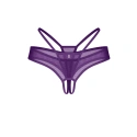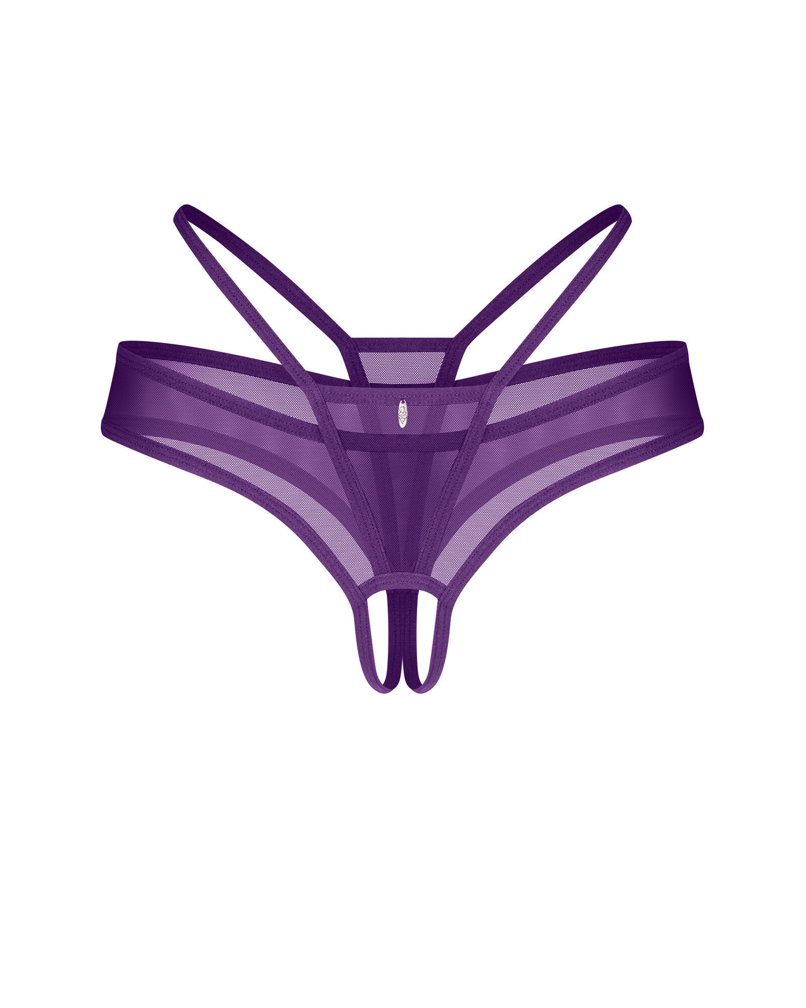 Tyto tanga bez rozkroku zaujmou odvážným designem a intenzivní, sytě fialovou barvou. Průhledná síťovina obepíná tělo jako druhá kůže, zatímco vrstvená hra pásků vytváří mimořádně smyslnou a moderní kompozici. Stříbrný přívěsek vpředu neodvádí pozornost od designu, ale podtrhuje jeho charakter. Vyrobeno, aby zapůsobilo, bez ohledu na příležitost.