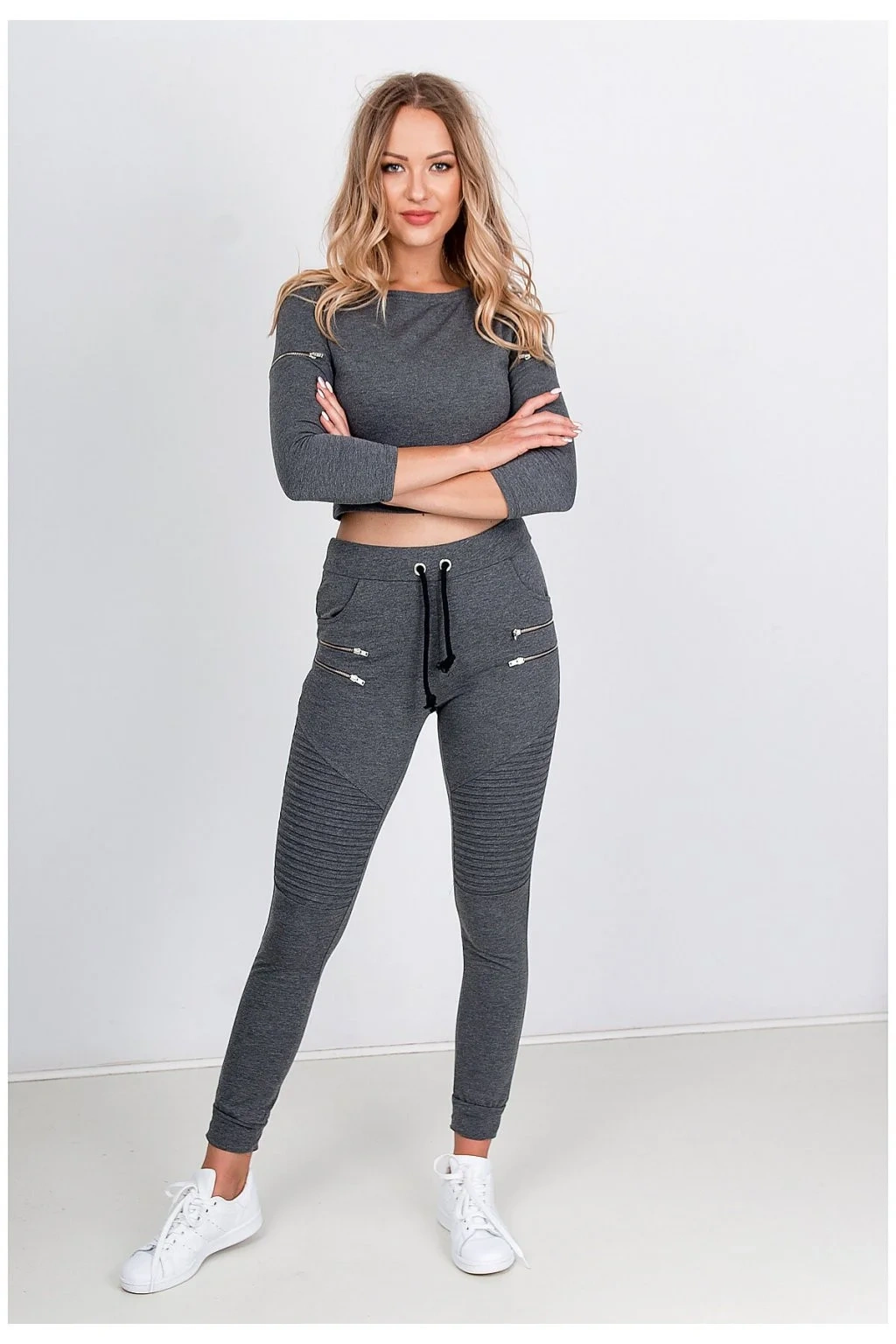 Dámské tepláky s aplikací se zapínanými kapsami na bocích. Kalhoty s dlouhými rovnými nohavicemi. V