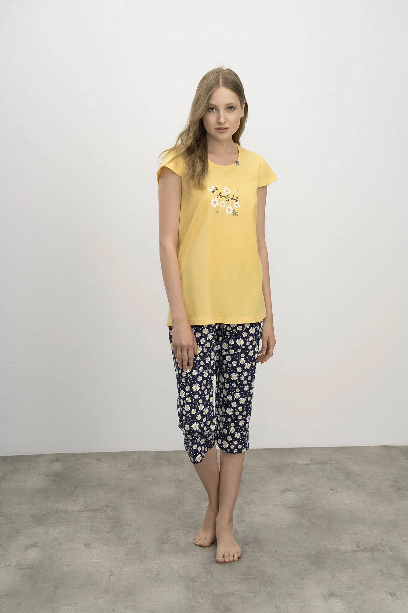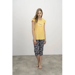 Dámské dvoudílné pyžamo, vrhcní díl jednobarevný s kulatým výstřihem a potiskem, spodní díl 3/4 kalhoty květované.