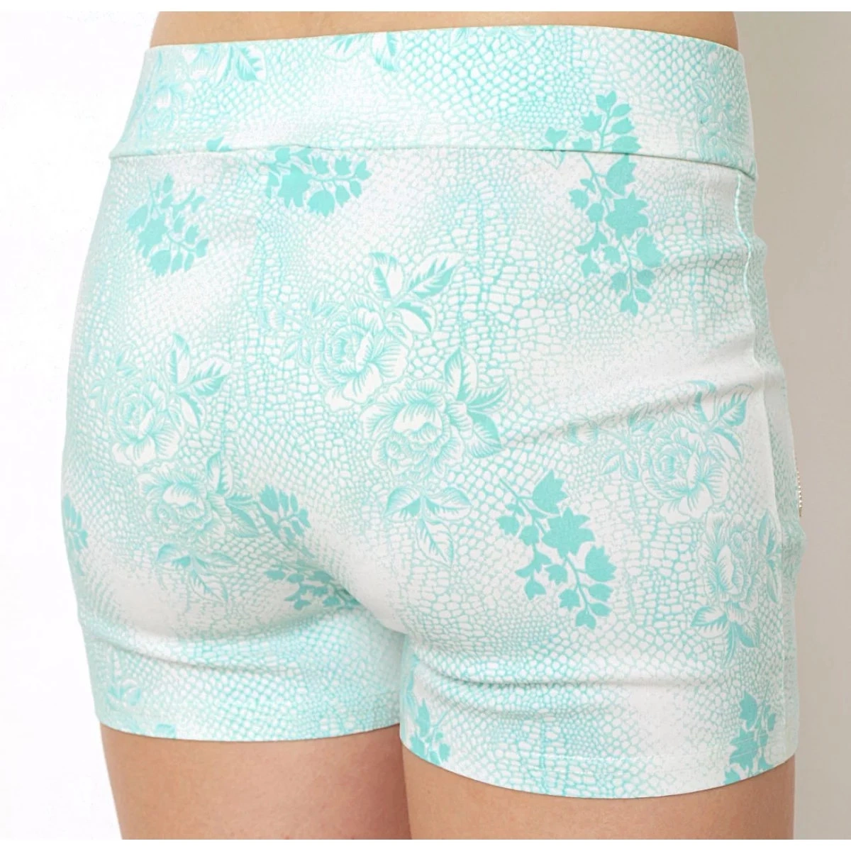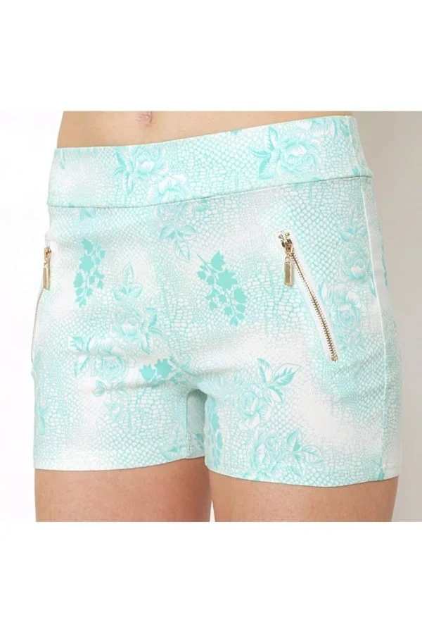 Dámské kalhoty šortky BLACK&FISH v přední partii ozdobené zlatými zipy na falešných kapsách. Materiál je velmi elasticky a šortky jsou proto sexy přiléhavé. Šortky jsou také ozdobené květinovým potiskem.
