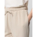 Bavlněný mušelín je velmi lehký, měkký na dotek a příjemný na kůži a díky volnější vazbě vláken je vzdušný a prodyšný, takže je ideální na léto. Kalhoty mají vysoký náplet, pružný pas se zavazováním, široké rovné nohavice a dvě otevřené kapsy.